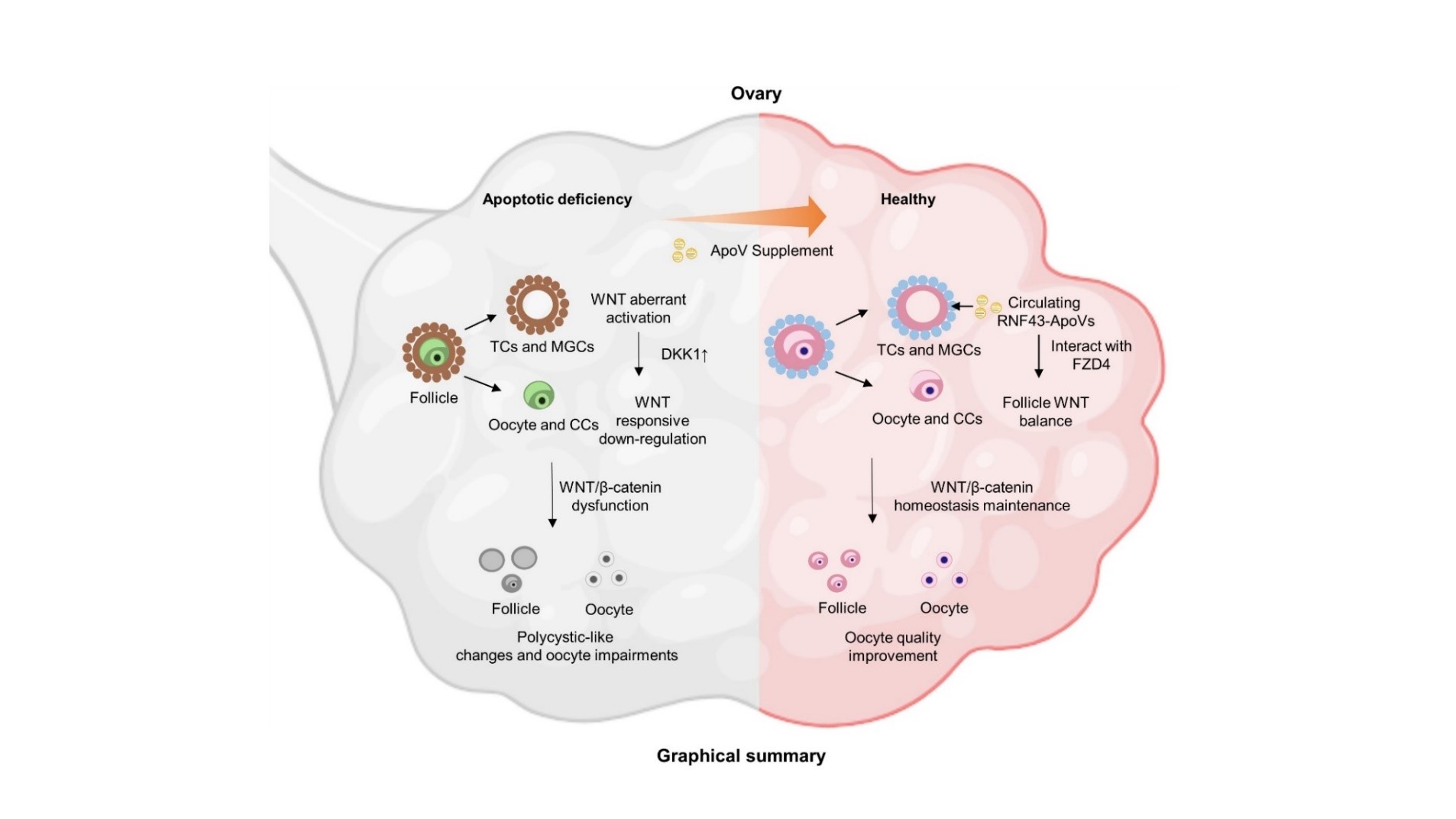 细胞凋亡是机体自发的一种程序性细胞死亡模式,在维持器官和组织稳态中具有重要作用。在细胞凋亡的末期,会产生一类由双层膜包被的凋亡产物,即凋亡囊泡(Apoptotic vesicles, ApoVs)。ApoVs已被证明广泛参与机体各器官的稳态维持和病理发展,然而,系统性ApoVs是否对卵巢发育和稳态具有调控作用仍然未知。