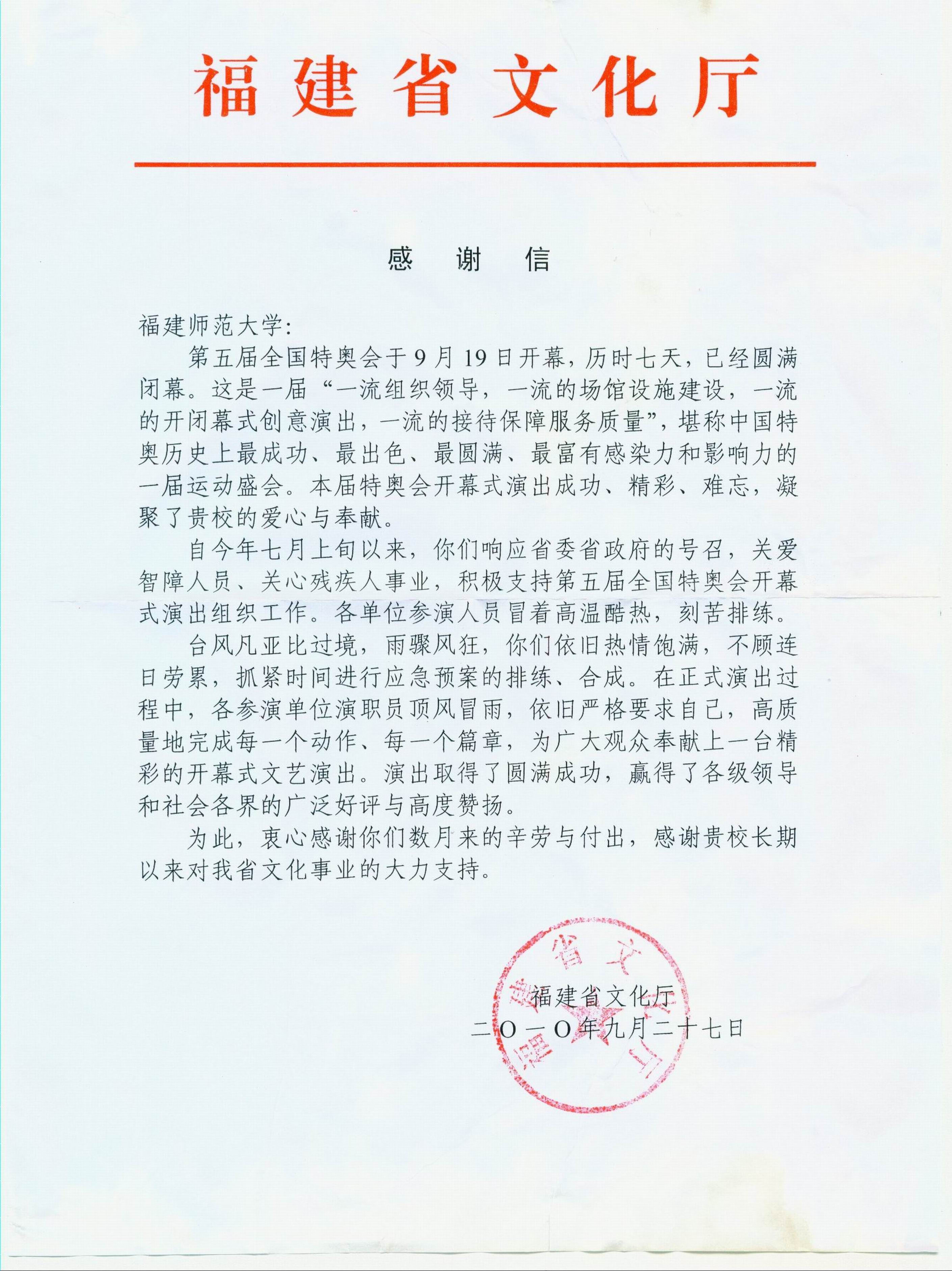 福建省文化厅致J9·九游会「中国」官方网站感谢信