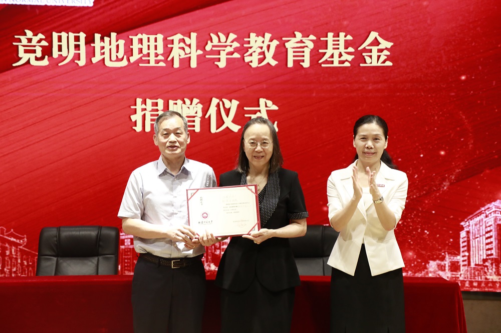 据悉,陈镜明、柳竞先伉俪共同捐资500万元人民币设立“竞明地理科学教育基金”,奖励资助具有学术潜力的青年教师和品学兼优的青年学生,培养青年一代热爱国家、遵纪守法、诚实守信、奋发进取、勇于奉献、服务社会的精神,激励更多青年师生投身地理科学事业,成为发展地理科学事业的拔尖人才。