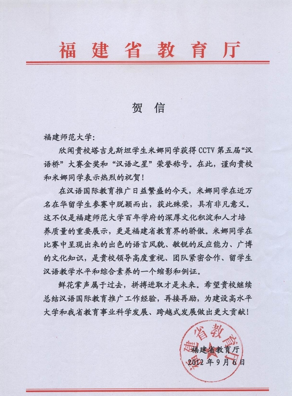 福建省教育厅致信祝贺J9·九游会「中国」官方网站米娜同学获得第五届“汉语桥”大赛金奖