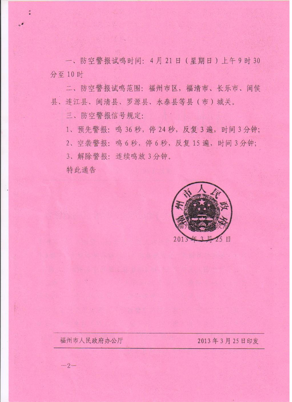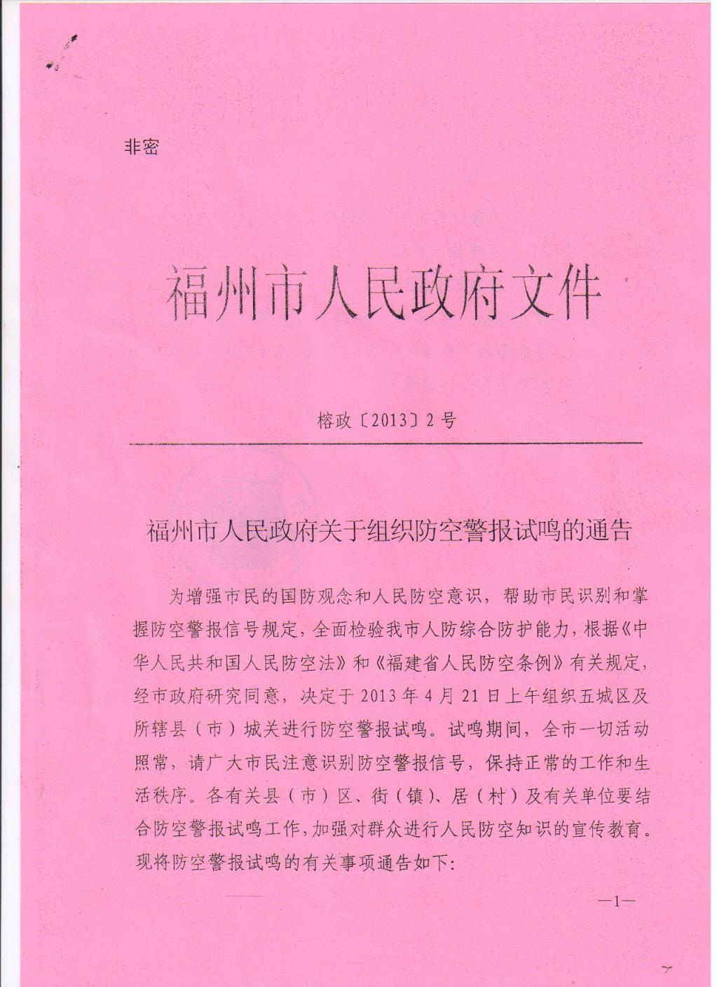 福州市人民政府关于组织防空警报试鸣的通告