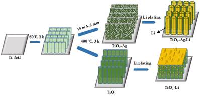 图1 3DTiO2纳米管阵列与其Ag纳米颗粒修饰制备过程及其不同的金属锂电镀效果示意图