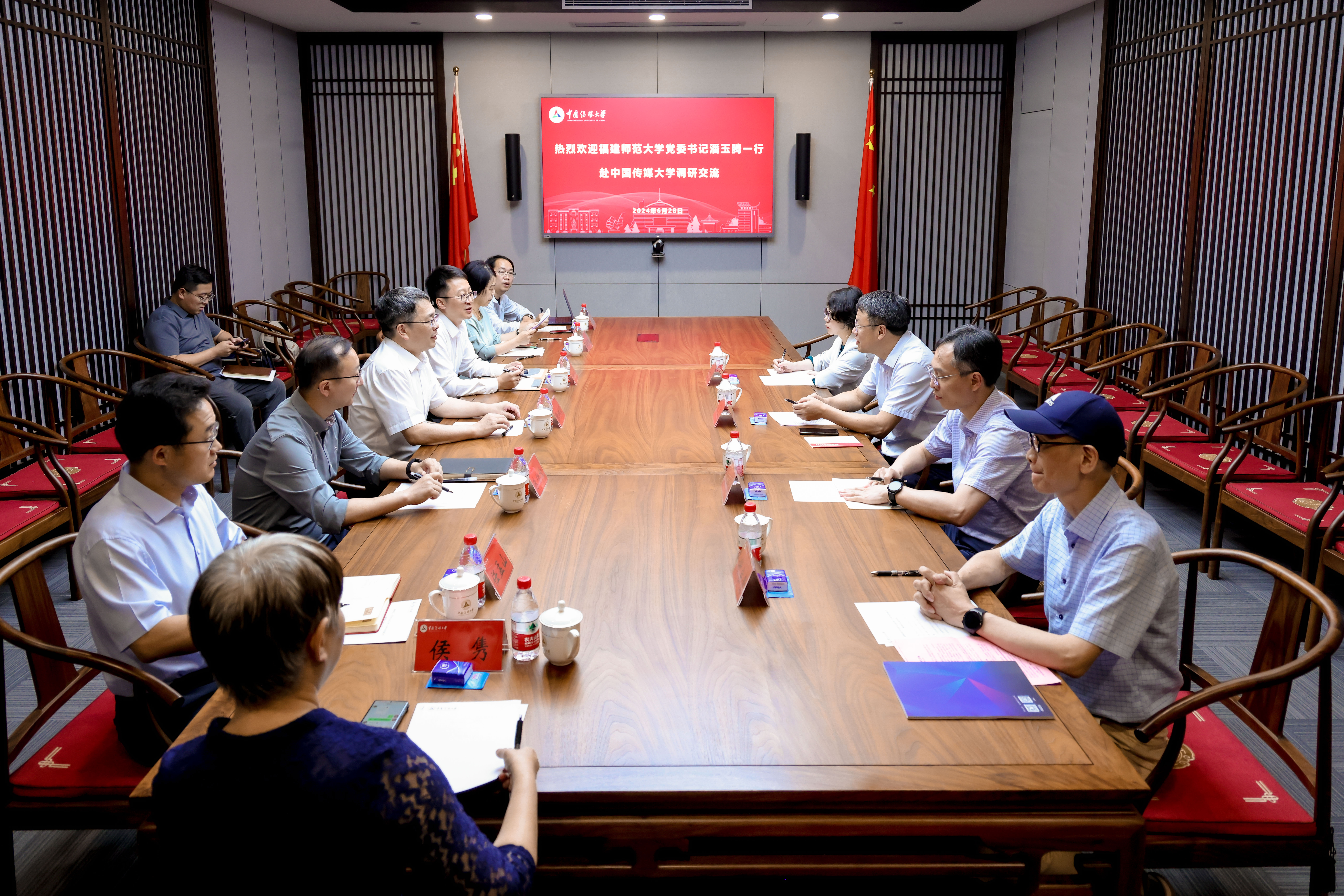 6月27日,校党委书记潘玉腾带领党政办公室、社会科学处、传播学院负责人到中国传媒大学调研交流。中国传媒大学党委副书记、校长张树庭,党委常委、副校长杨懿,党政办公室,本科生院,研究生院,科学研究处,媒体融合与传播国家重点实验室负责人参加调研座谈会。座谈会由杨懿主持。