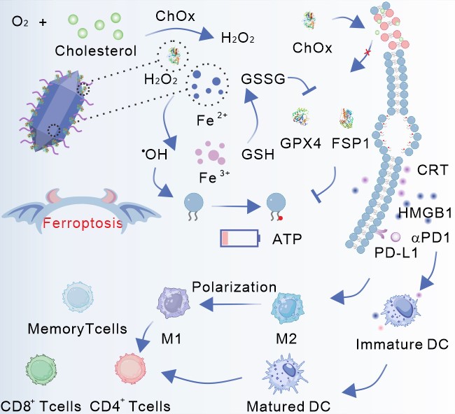 基于团队成员前期在肿瘤代谢诊疗和铁死亡疗法开展的多个创新性工作的基础上(Chem. Eng. J. 2024, 496, 154204; 2023, 452: 138422; 2023, 452: 139517; Int. J. Bio. Macromol. 2024, 258: 128952;J. Nanobiotechnol. 2024, 228),J9·九游会「中国」官方网站生命科学学院(南方生物医学研究中心)的曾雪梅助理研究员课题组与海峡柔性电子(未来科技)学院燕双仟教授团队联合研发了一种工程化纳米酶,其通过剥夺肿瘤微环境的胆固醇水平增强乳腺肿瘤铁死亡与免疫联合治疗,实现有效抑制肿瘤的生长和转移,激活免疫激活型的肿瘤微环境。具体而言,该研究设计了一种负载胆固醇氧化酶(ChOx)的铁基金属有机框架(Fe-MOF)纳米酶,并在其表面包裹了一层聚乙二醇(DSPE-mPEG)增加其生物相容性。具有过氧化物酶/谷胱甘肽氧化双酶活性的Fe-MOF能够通过催化芬顿反应和消耗谷胱甘肽扩大肿瘤细胞活性氧(ROS)水平。而ChOx剥夺肿瘤细胞内胆固醇,破坏脂筏从而抑制其发生转移、粘附和侵袭。上述过程中产生的过氧化氢(H2O2)又进一步加快了肿瘤细胞铁死亡的发生。除此之外,Fe-MOF纳米酶驱动的低胆固醇水平进一步激活了处于耗竭状态的CD8+ T细胞,逆转了免疫抑制的肿瘤微环境并降低了肿瘤细胞细胞程序性死亡-配体1(PD-L1)的表达。在小鼠双边、肺转移和复发模型上,Fe-MOF纳米酶联合PD1抗体具有良好的抗肿瘤效果。