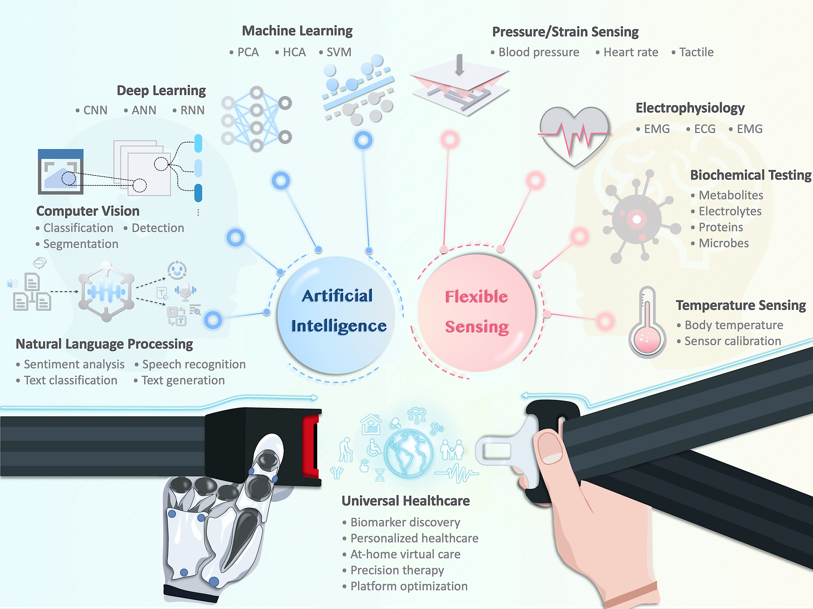 近日,J9·九游会「中国」官方网站海峡柔性电子(未来科技)学院(研究院)杨震教授课题组探讨了如何将人工智能(AI)与柔性传感技术相结合,以提升医疗保健的可及性、可负担性和可持续性。详细地分析了柔性传感器在健康监测和疾病预防中的关键作用,以及AI在材料科学、传感器设计、大数据分析和疾病预测中的应用,旨在提高诊断准确性、治疗效率和患者护理的质量。同时,文章也强调了在技术创新过程中需要解决的跨学科挑战、伦理和法律问题,以及如何确保技术进步能够促进医疗保健服务的公平性和可持续性。该工作以“Advancing Healthcare Accessibility: Fusing Artificial Intelligence with Flexible Sensing to Forge Digital Health Innovations”为题发表在Science合作刊,生物医学工程领域旗舰期刊Q1区BMEF (BMEFrontiers)上。