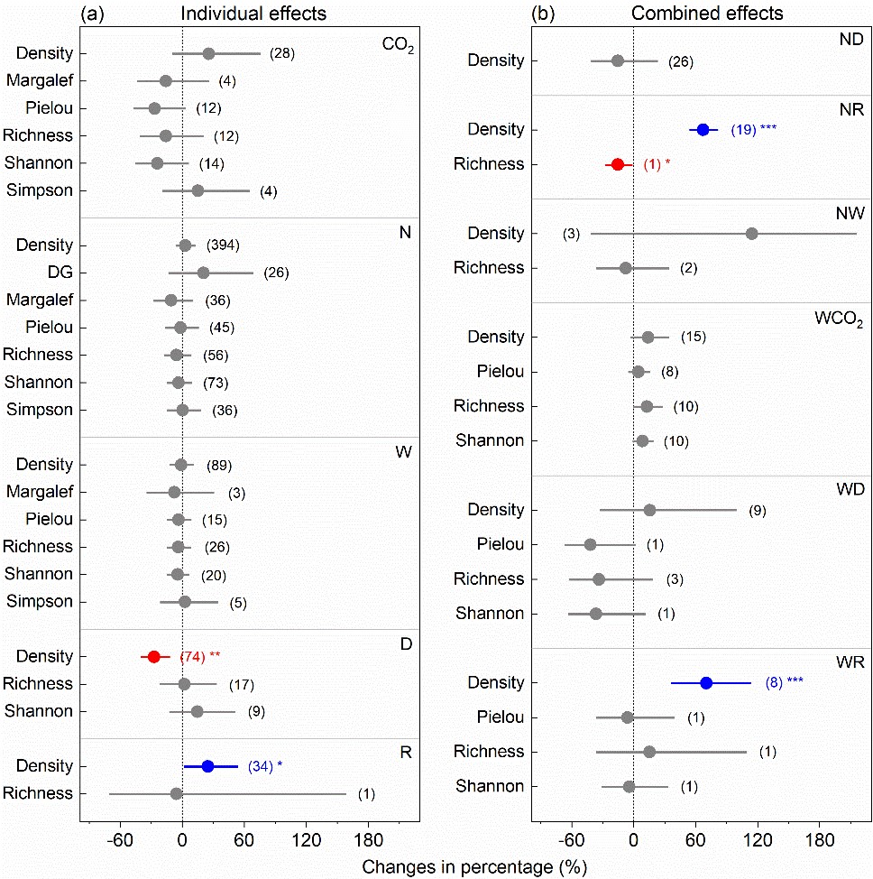 结果发现:(1) 整体而言,全球变化各因子的单独作用和综合作用对土壤动物群落丰度及多样性影响较小,但减雨显著降低了土壤动物丰度(-27.4%),而增雨及其与氮沉降、增温的综合作用均显著增加了土壤动物的丰度,且分别为24.9%、67.3%及70.4% (图2);(2) 全球变化各因子对土壤动物群落结构的影响在不同分类群间存在显著差异;(3) 不同全球变化因子的单独作用及综合作用对土壤动物群落结构的影响受到纬度、海拔及实验设计等因素的显著调控。