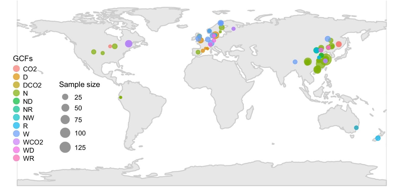 土壤动物不仅是凋落物分解的重要驱动因子,同时也是陆地生态系统生物地球化学循环的主要参与者,但区域和全球尺度上土壤动物群落对全球变化各因子的响应目前还未得到共识。基于此,研究团队收集了目前已发表相关文献中共1154个(图1)观测值定量评估了CO2浓度升高、氮沉降、增温、增雨及减雨的单独作用(individual effects)和综合作用(combined effects)对土壤动物丰度(density)和多样性不同指数(Margalef index, Pielou index, richness, Shannon-Wiener index, and Simpson index)的影响。