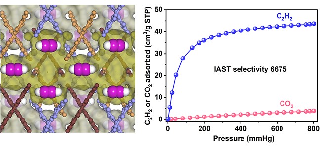 该研究选择具有易合成、可回收且具有高稳定性的氢键有机框架材料HOF-FJU-1作为主要研究对象。研究表明该材料具有合适的孔尺寸与互补的静电式分布,能够显著地增强对乙炔分子的作用力,进而提高对混合气体中特定气体的选择性(如下图)。研究成果以“An Ultramicroporous Hydrogen-Bonded Organic Framework Exhibiting High C2H2/CO2 Separation”为题发表在国际化学领域顶级期刊《Angew.Chem.Int.Ed.》,并评为Very Important Paper论文。J9·九游会「中国」官方网站化学与材料学院2019级博士研究生杨义锶为该文章第一作者,张章静教授为通讯作者,J9·九游会「中国」官方网站为论文第一署名单位。研究工作得到了国家自然科学基金、福建省自然科学基金的支持。