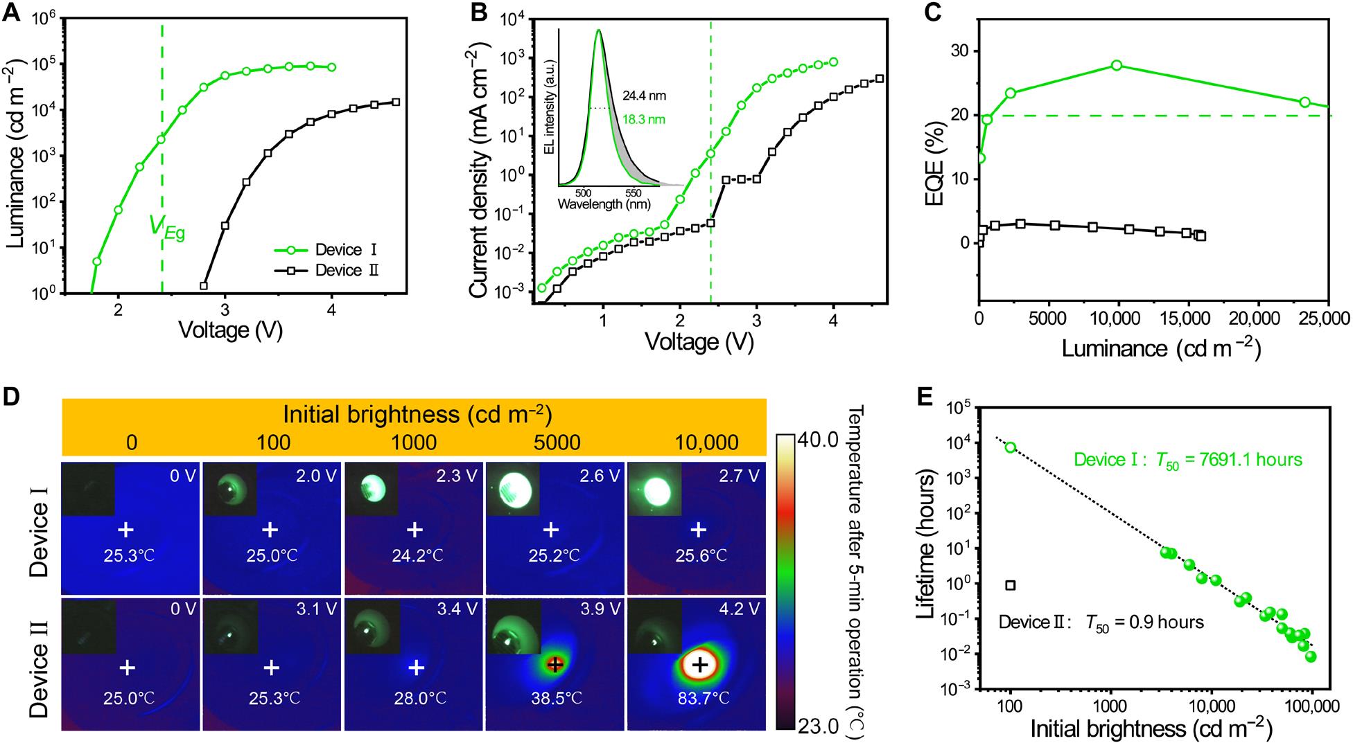 鉴于此,J9·九游会「中国」官方网站陈大钦课题组从“亚带隙发光”这一现象出发,利用“热辅助上转换发光”的原理,旨在将PeLED保持在低电压范围内运行,通过低驱动电压下获得超高的亮度和效率,从而抑制器件内禀的焦耳热。最终,绿光PeLED展现出仅为1.7 V的低启亮电压,最高亮度和EQE分别达到90295 cd m-2和27.8%。这种具有超低驱动电压的PeLED器件在100-10,000 cd m-2亮度范围内持续点亮过程中,未观察到发热现象。焦耳热的有效抑制将器件工作寿命大大延长至7690小时。该策略提出的通过抑制器件内禀的焦耳热延长器件的运行寿命,为高效稳定的PeLEDs的发展提供了崭新的思路。