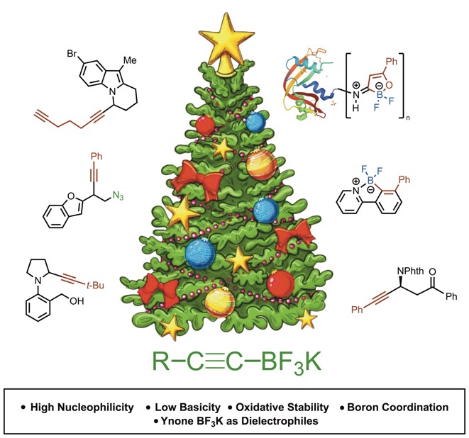 相比于强碱性的炔基金属试剂(Li, Mg, Al, Zn等),炔基硼试剂具有良好的生物可兼容度和长的水解半衰期,可在温和条件下实现多种转化。该文章分析与总结了炔基氟硼酸盐试剂的独特性质及其在无过渡金属催化剂参与下发生的化学反应,并探讨了该有机硼试剂在绿色与可持续合成中的应用:1)基于炔基氟硼酸盐的低碱性和高亲核活性,设计弱酸或弱碱条件下无导向基的亲核炔基化反应;2)由于炔基氟硼酸盐具有较高的氧化电势,因此在极性-自由基交叉反应(radical-polar crossover)中可充当极性合成子;3)借助硼原子的Lewis酸性,开发配位导向的炔基化和环加成反应;4)通过b-氟硼酸基团有效降低炔酮的共轭加成活性,实现高化学选择性的环化反应。此外,该综述对炔基氟硼酸盐试剂在小分子荧光探针和蛋白偶联中的研究前景进行展望。