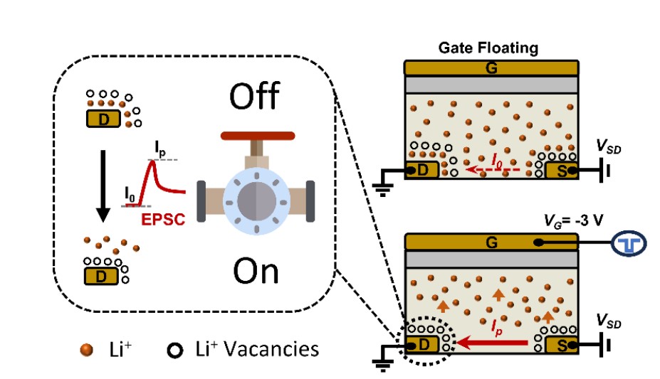 传统的冯诺依曼计算机架构已无法满足日益庞大的数据需求,而模拟人脑系统的新型神经形态计算为突破这一瓶颈提供了新的范式。突触晶体管模仿生物突触的行为,在神经形态系统中的信息处理和存储中起着至关重要的作用,其中锂基器件在未来快速低能耗神经网络硬件应用中存在巨大潜力。然而,在更新突触权重时,过高的电流尖峰(EPSC)会影响突触晶体管的稳定性、准确性和功耗。此外,目前已有的研究缺乏对EPSC过程所涉及的锂离子扩散机制的深入探讨及相应的实验证据,而解决过高电流尖峰问题的有效策略也较为稀缺。