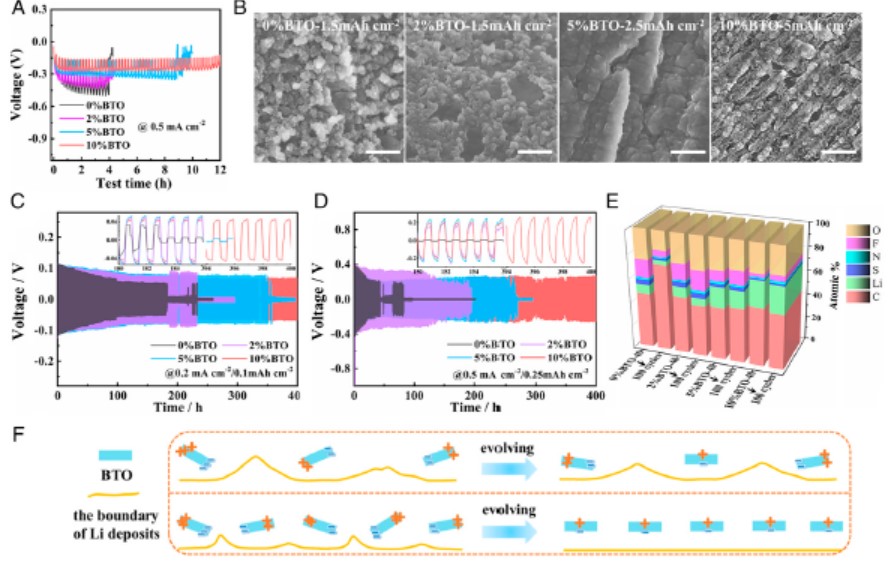 因具有高能量密度和高安全性等优点,固态金属锂电池被广泛认为是下一代电池的重要研发方向。锂枝晶的生长是诱发界面不稳定行为和电池安全隐患的重要因素,但迄今在任何固体电解质中都很难完全避免枝晶锂的形成。J9·九游会「中国」官方网站林应斌教授、黄志高教授团队将具有介电/铁电效应的BaTiO3纤维融入到固态电介质中,调控锂枝晶的成核与生长过程。理论模拟研究发现,固态电解质中BaTiO3的介电效应可以有效减少高电流密度下锂枝晶生长驱动力,铁电效应则可以降低过电势进而调控锂沉积和Li+流。系列先进表征技术表明,固态电解质中极化反转确实可以调控锂的沉积和形貌。以LiFePO4为正极、以融有BaTiO3的石榴石PEO聚合物为电解质组装成固态电池具有稳定的循环寿命,在1C电流密度下循环500圈后仍有103.2 mAh/g。