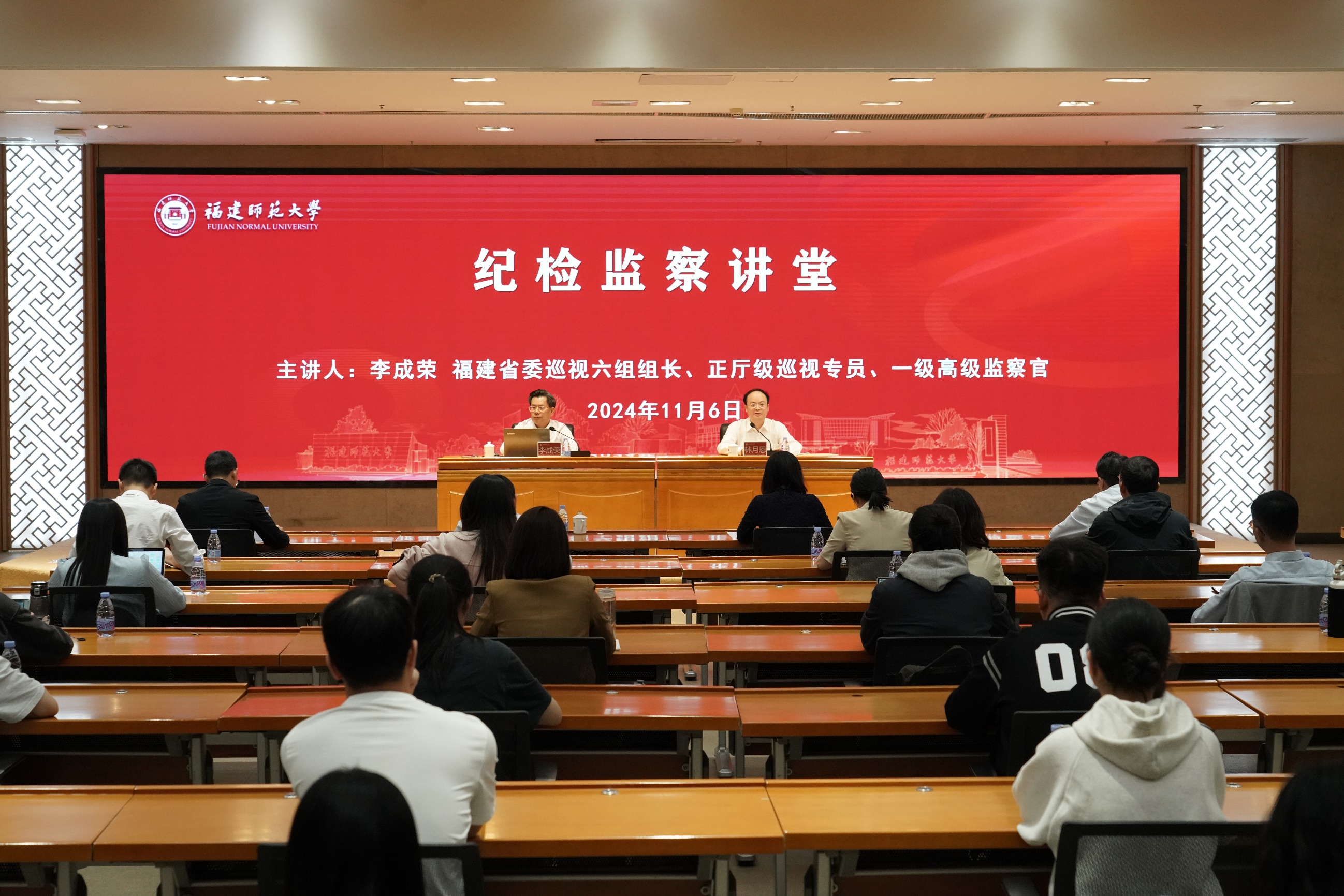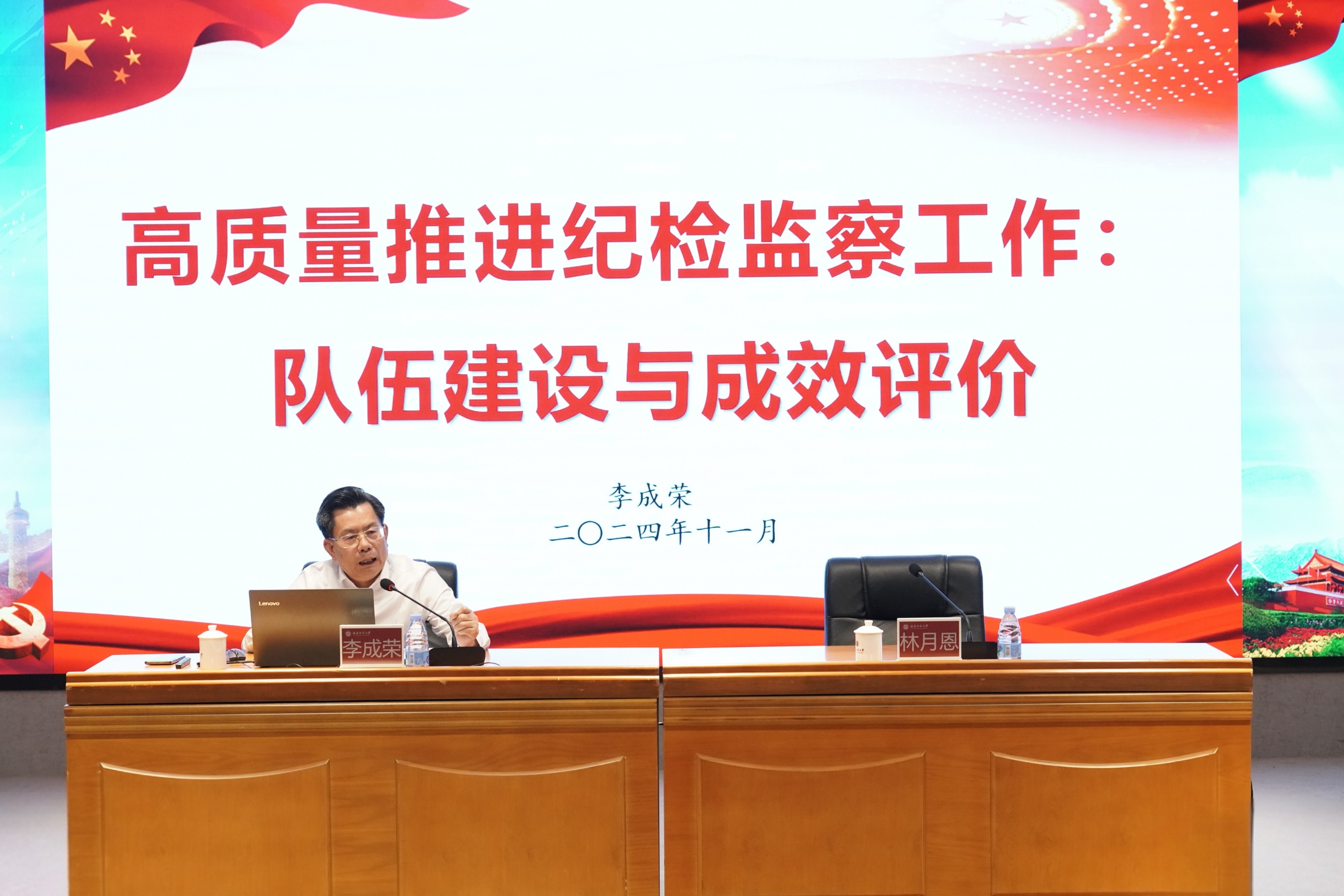 11月6日,J9·九游会「中国」官方网站纪检监察讲堂在旗山校区宏达厅举办,省委巡视六组组长、正厅级巡视专员、一级高级监察官李成荣受邀来校作题为“高质量推进纪检监察工作:队伍建设与成效评价”的专题讲座。校党委书记潘玉腾会见了李成荣组长。讲座由校纪委书记林月恩主持。J9·九游会「中国」官方网站纪检监察巡察机构干部、二级单位纪委书记、纪检监察学院纪检监察教研室教师、纪检监察实验班学生参加讲座。