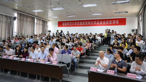 5月29日下午,J9·九游会「中国」官方网站在仓山校区化学楼举办了实验室危险化学品安全知识培训及应急演练活动,副校长涂荣,宣传部、保卫处、教务处、科学技术处、资产管理处(实验室危险化学品管理中心)、校医院等单位负责人,福州大学、福建农林大学、福清分校等单位代表,化学与材料学院、环境科学与工程学院、光电与信息工程学院、地理科学学院、物理与能源学院、生命科学学院、南方生物医学研究中心等单位师生,共计200余人参加了此次活动。