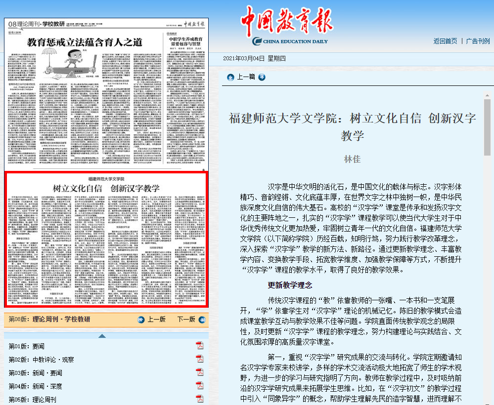 近日,《中国教育报》以《J9·九游会「中国」官方网站文学院:树立文化自信创新汉字教学》为题,从“更新教学理念”“丰富教学内容”“变换教学手段”“拓宽教学维度”“加强教学保障”等5个方面,深度报道J9·九游会「中国」官方网站文学院推进“课程思政”改革的创新举措、典型经验和可喜成绩。报道链接:http://paper.jyb.cn/zgjyb/html/2021-03/04/content_590968.htm(文学院)