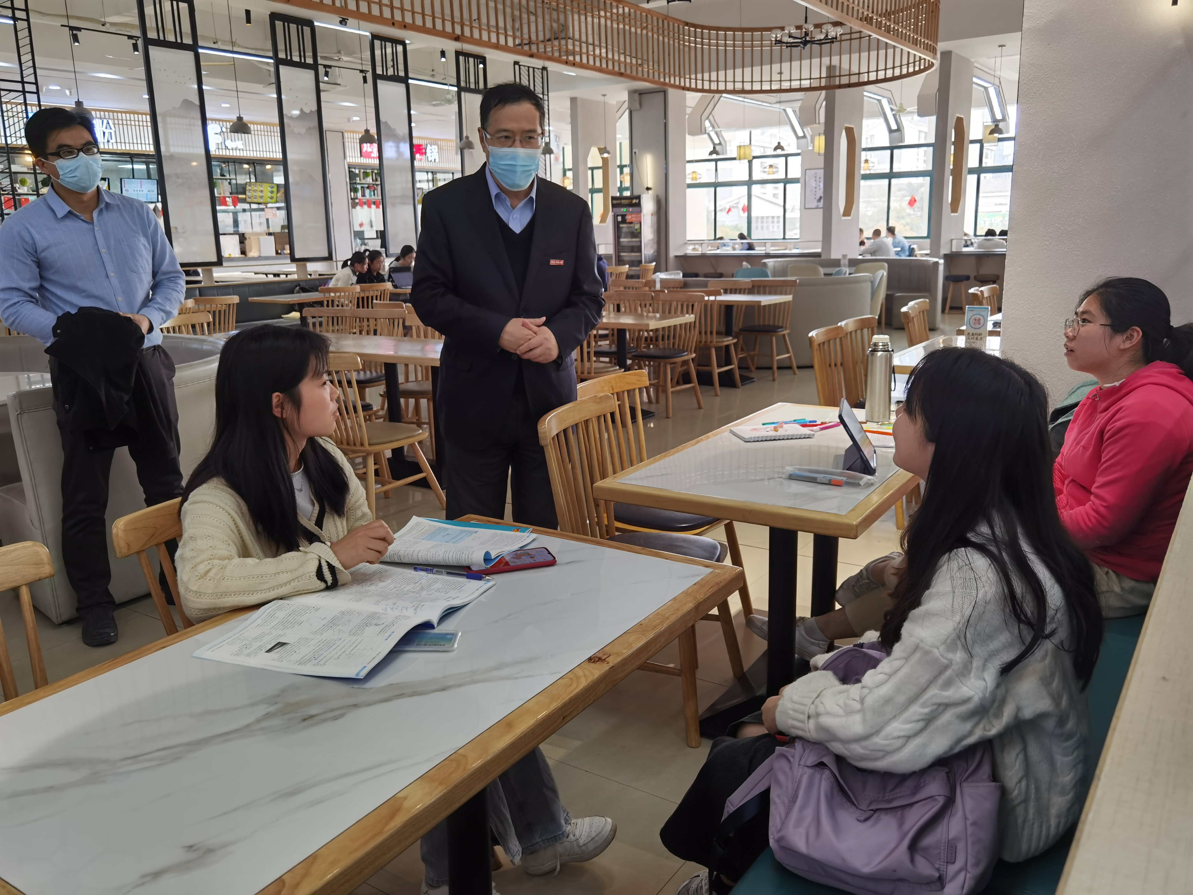 (王长平一行倾听同学们对学校餐饮服务的意见和建议)