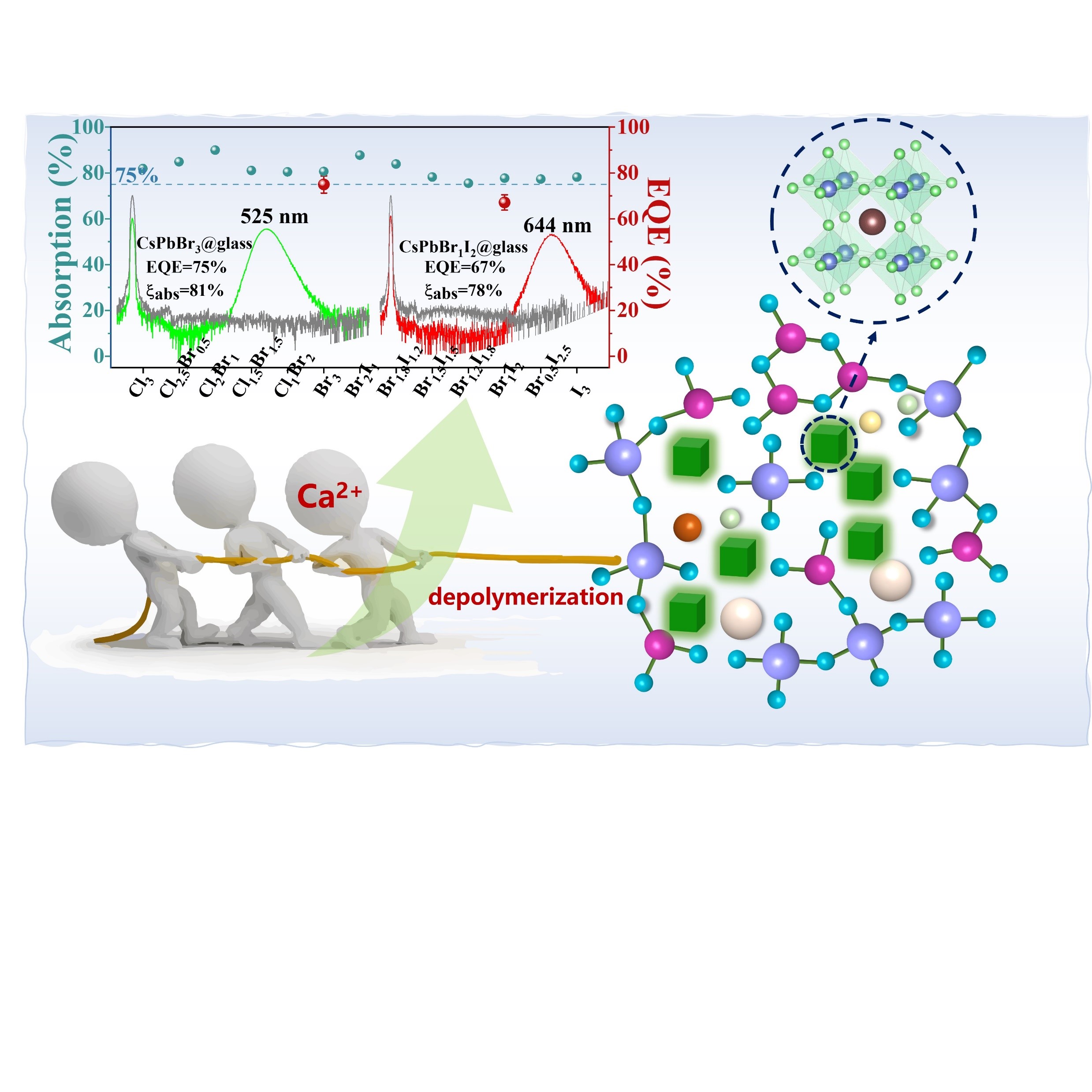 在无机玻璃中原位生长CsPbX3 (X=Cl、Br、I)钙钛矿量子点(PeQDs)可以解决其稳定性问题,在宽色域背光显示领域展现出极大的市场前景。然而,大多数已报道的CsPbX3量子点玻璃(CsPbX3@glass)都受到低吸收率和低外量子效率(EQE)的限制。