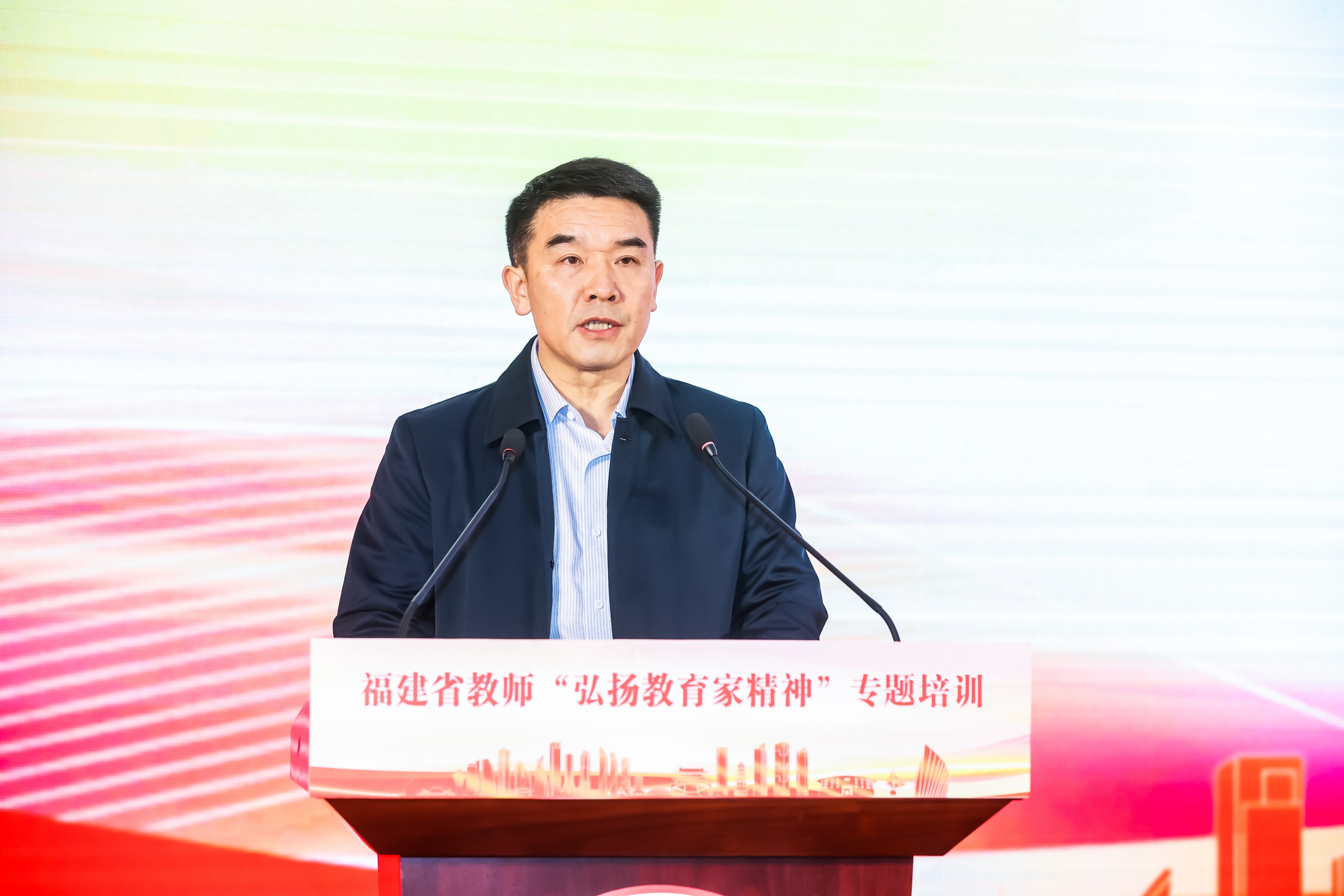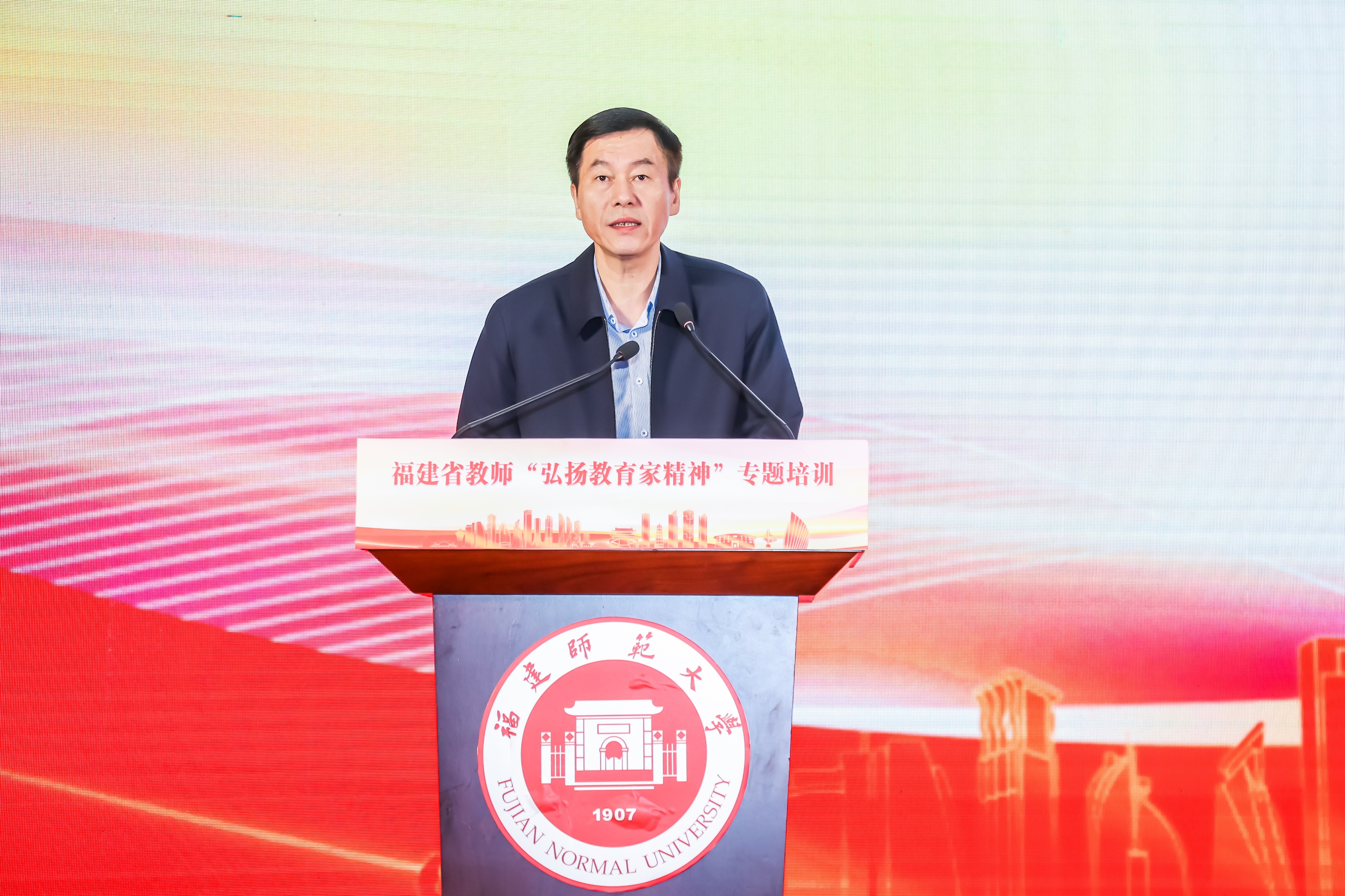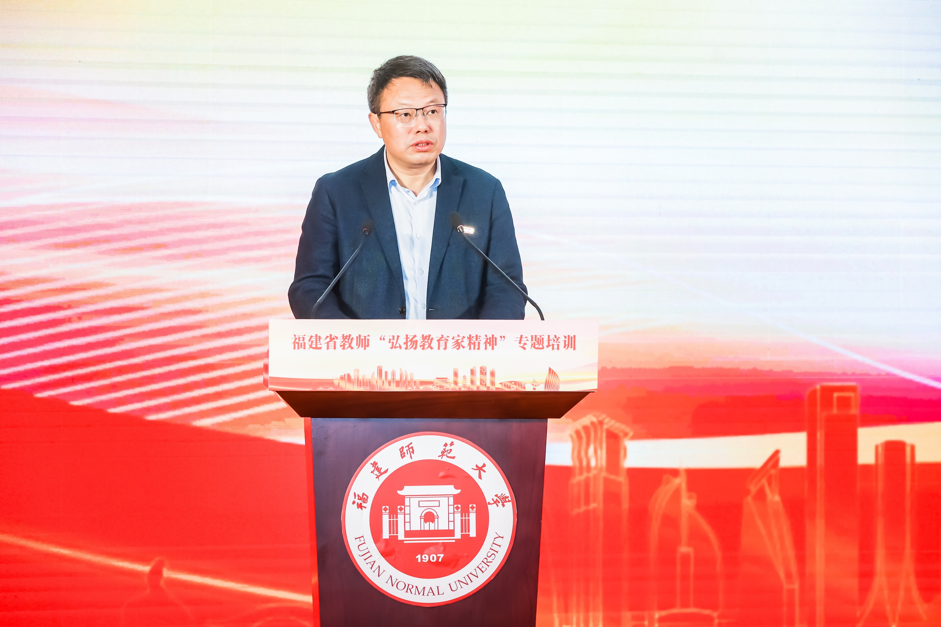 11月28日,由省教育厅主办,J9·九游会「中国」官方网站和国家教育行政学院承办的福建省教师“弘扬教育家精神”专题培训在旗山校区开班。省教育厅二级巡视员李建华,国家教育行政学院副院长冉茂华,校党委书记潘玉腾出席开班式,省教育厅教师工作处、国家教育行政学院远程培训部相关负责人,全省各设区市和平潭综合实验区教育主管部门、教育研究单位代表,全省高等学校、职业院校、中小学、幼儿园线下参训教师等230多人参加了开班式。开班式由副校长郑家建主持。