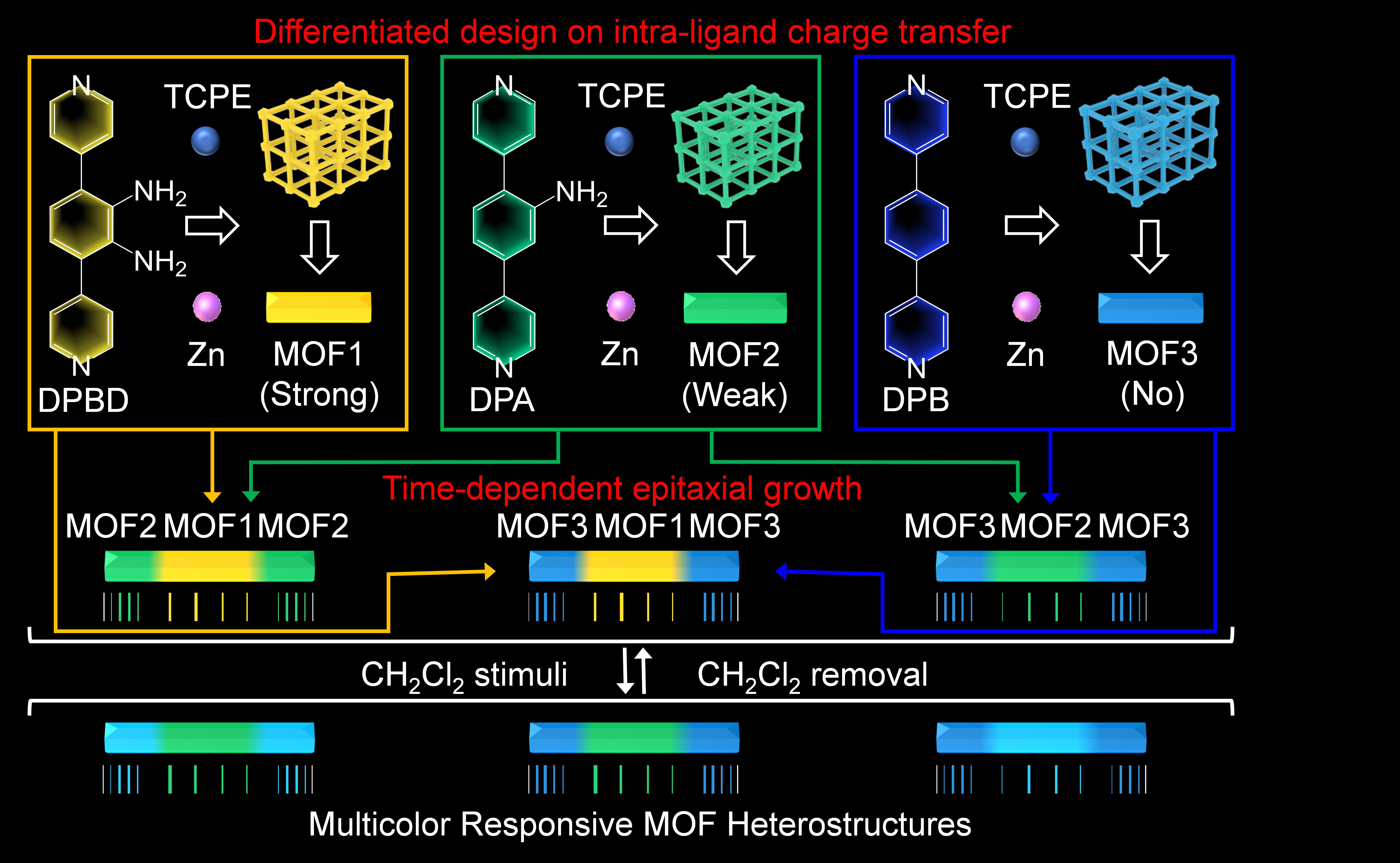 配体内电荷转移的差异化设计可以使光学配体既具有不同的本征发射,又对相同的温和刺激具有不同的响应行为,从而有利于构建多色响应的MOF异质结构。此外,不同的配体内电荷转移可以由相同类型的供电子/受电子基团来完成,有利于出现相似的配体构象,可有效抑制MOF异质结构中的晶格失配。因此,在有机配体中设计差异化的配体内电荷转移为构建智能响应的多色MOF异质结构提供了一种前景广阔的方法,可用于制造稳健的先进防伪器件。