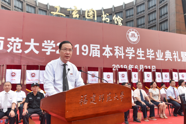 典礼于6月21日上午在旗山校区图书馆前广场隆重举行。校领导李宝银、王长平、潘玉腾、叶燊、郑家建、涂荣,机关各部处负责人,各学院党政负责人、教师代表、毕业班辅导员、校职工代表,全体2019届本科毕业生,以及部分毕业生家长等共6000多人参加了毕业典礼。典礼由校党委副书记叶燊主持。