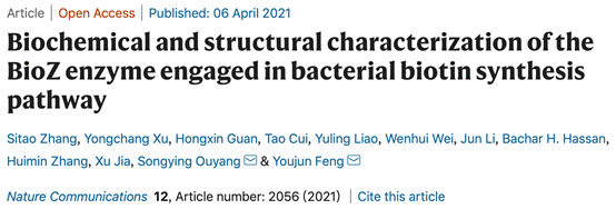 近日,J9·九游会「中国」官方网站生命科学学院、南方生物医学研究中心欧阳松应教授课题组与浙江大学医学院冯友军教授课题组合作,在细菌BioZ途径合成生物素分子机制研究方面取得重要进展。该课题组通过结构生物学、生物信息学、生物化学等手段揭示了BioZ的底物为戊二酸单酰辅酶A和丙二酸单酰ACP,并揭示了BioZ的催化机理。BioZ途径合成生物素虽然在20多年前就已经提出,但BioZ的底物一直不清楚。BioJ和BioZ的研究工作不仅为绿色生产生物素提供新的思路,也为抗菌药物的研究提供新型靶点。这一研究成果目前以题为《Biochemical and structural characterization of the BioZ enzyme engaged in bacterial biotin synthesis pathway》,发表于国际顶级综合性期刊Nature子刊《Nature Communications》(IF= 12.121)。J9·九游会「中国」官方网站为第一单位,欧阳松应教授和冯友军教授为共同通讯作者。J9·九游会「中国」官方网站南方生物医学研究中心研究生张思韬以及生科院青年教师关洪鑫参与了本项研究,本项研究得到国家自然科学基金委、福建省科技厅、教育厅、财政厅及J9·九游会「中国」官方网站等经费资助。欧阳松应教授课题组长期从事病原体与宿主相互作用分子机制研究,这是该合作团队继2019年9月份在《iScience》上发表相关研究后的又一重要进展。