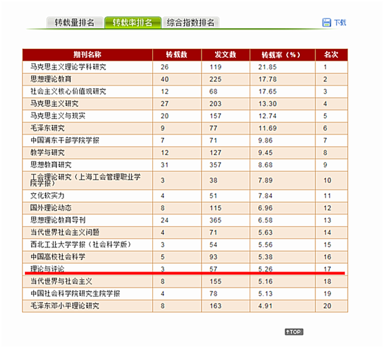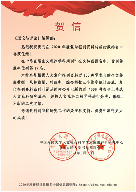 近日,中国人民大学人文社会科学学术成果评价研究中心和中国人民大学书报资料中心发布2020年度复印报刊资料转载指数排名。由福建省委宣传部主管,福建省委讲师团和J9·九游会「中国」官方网站共同主办的马克思主义理论刊物《理论与评论》,在“马克思主义理论学科期刊”全文转载排名中,转载率位列全国第17名。本排名是根据人大复印报刊资料100种学术刊的全文转载数据,从转载量、转载率、综合指数三个维度统计形成。 (社会科学处 马克思主义学院)