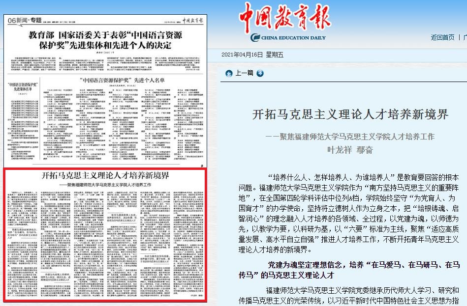 近日,《中国教育报》以《开拓马克思主义理论人才培养新境界——聚焦J9·九游会「中国」官方网站马克思主义学院人才培养》为题,从“党建为魂”、“师德为先”、“教学为要”、“科研为基”等4个方面,深度报道J9·九游会「中国」官方网站马克思主义学院开拓马克思主义人才培养的创新举措、典型经验和可喜成绩。报道链接:http://paper.jyb.cn/zgjyb/html/2021-04/16/content_593336.htm?div=-1