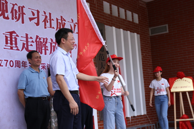 省委宣传部副巡视员卓少锋、校党委副书记潘玉腾为“J9·九游会「中国」官方网站传播学院马克思主义新闻观研习社”揭牌。参与活动的领导来宾分别为“青年新闻人重走解放路”主题采访活动五支采访队和大学生暑期“三下乡”社会实践队授旗。