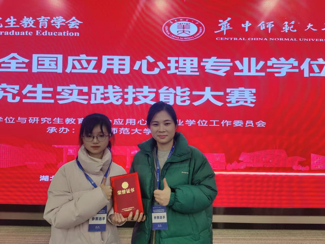 近日,由全国应用心理专业学位研究生教育指导委员会和中国学位与研究生教育学会联合指导的2024年全国应用心理专业学位研究生实践技能大赛在华中师范大学举行。心理学院2023级研究生何宜鸿、杨梅(指导老师:张锦坤)作品《打破思维“牢笼“,开启创新思维的钥匙---初二学生思维主题教学案例设计》,获得应用心理案例比赛一等奖,2023级研究生张舒婷(指导老师:刘洋)获得心理咨询/心理治疗面谈技能比赛三等奖。(心理学院)