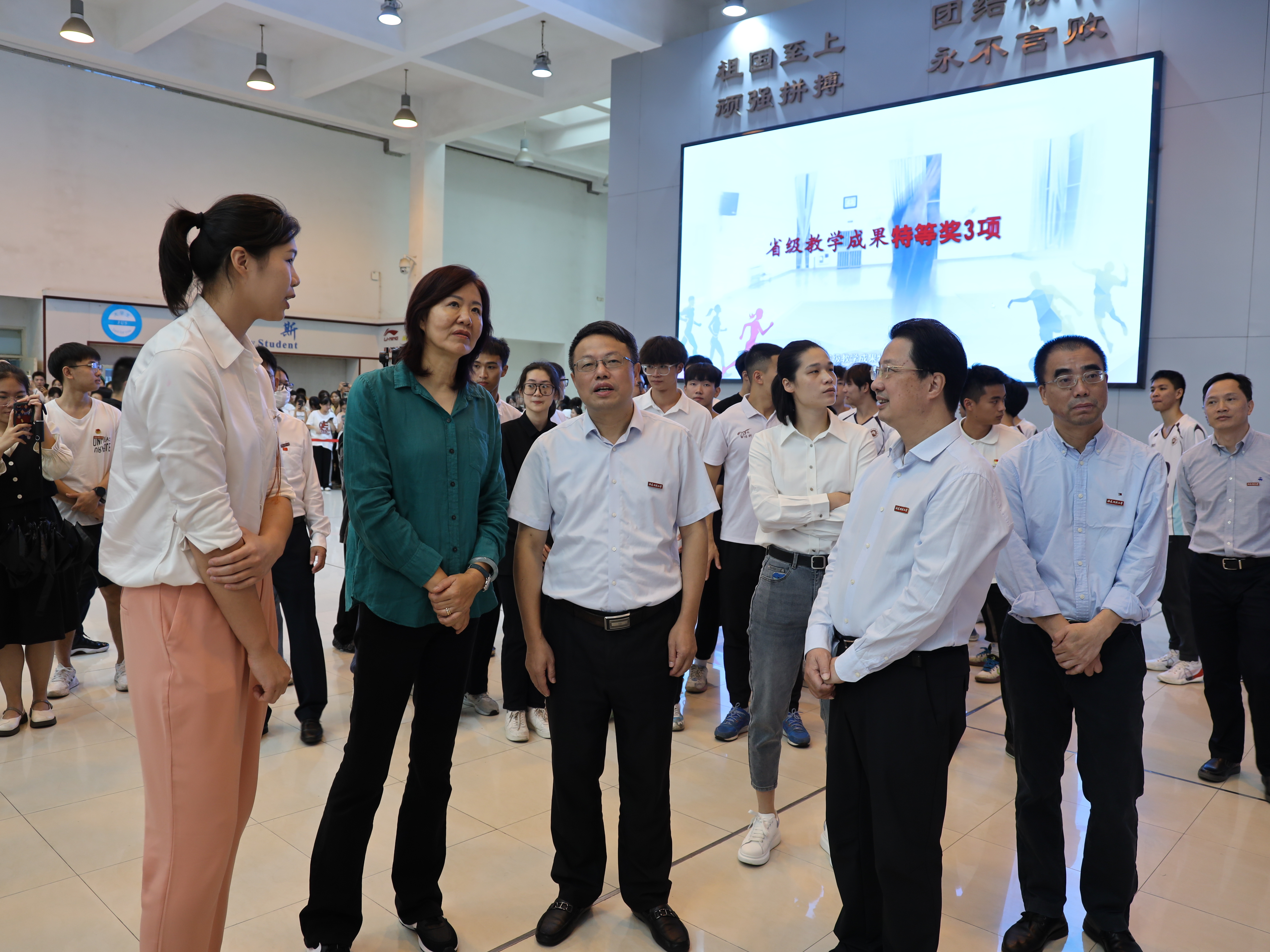 10月17日,中国排球协会副主席、中国排球学院院长、北京师范大学研究员郎平女士莅校参访,并与前中国女排运动员、奥运冠军徐云丽、林莉共同参加“学习二十大,青春榜样说——女排精神分享会”。校领导潘玉腾、郑家建,以及学校有关职能部门、体育科学学院负责人陪同参访。