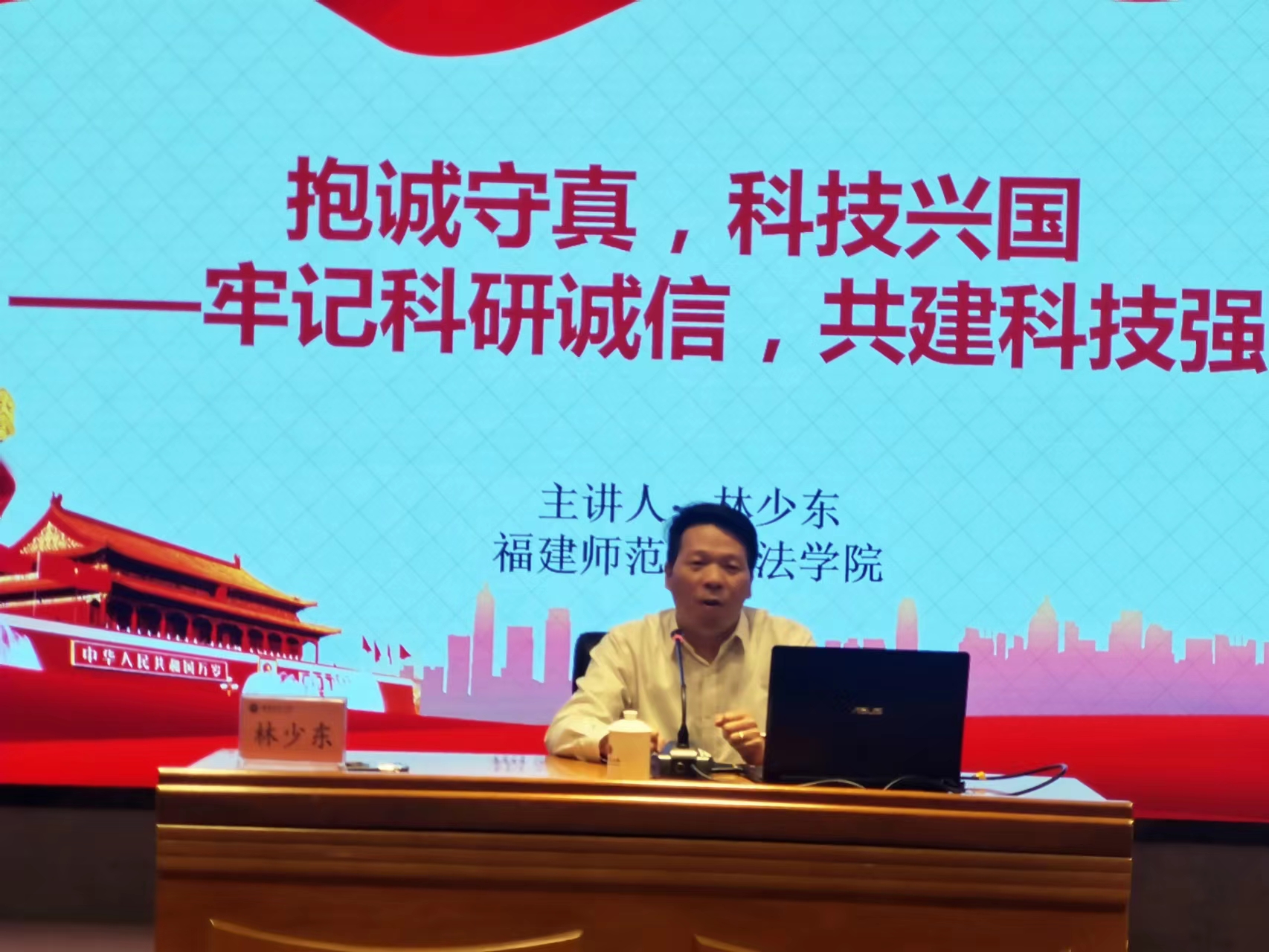 会上,J9·九游会「中国」官方网站法学院林少东副教授作了《抱诚守真,科技兴国 牢记科研诚信,共建科技强国》专题报告,向学校师生、科研管理教职工宣传解读了《科研失信行为调查处理规则》、《科研失信行为调查处理规则》、《科学技术活动违规行为暂行规定》等政策文件,并结合失信行为案例做了深入浅出的阐释。