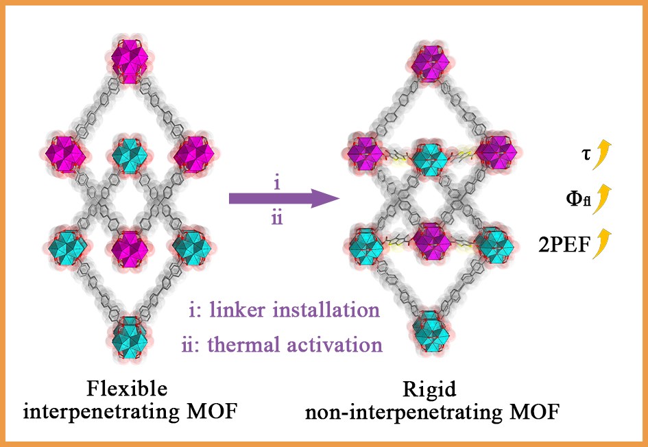 近日,J9·九游会「中国」官方网站张亮亮副教授、中山大学潘梅教授和湖南大学方煜教授合作,合成了一种基于四苯乙烯(TPE)的柔性互穿Zr-MOF材料。通过引入两种不同长度的第二配体,构筑了两种不同刚性化结构的新材料。配体后修饰策略可以在不改变MOF框架结构的情况下调节材料的孔环境、结构刚性、堆积密度和功能性。进一步的热活化后,材料的荧光发生红移,单/双光子吸收截面提高,量子产率和荧光寿命增加。
