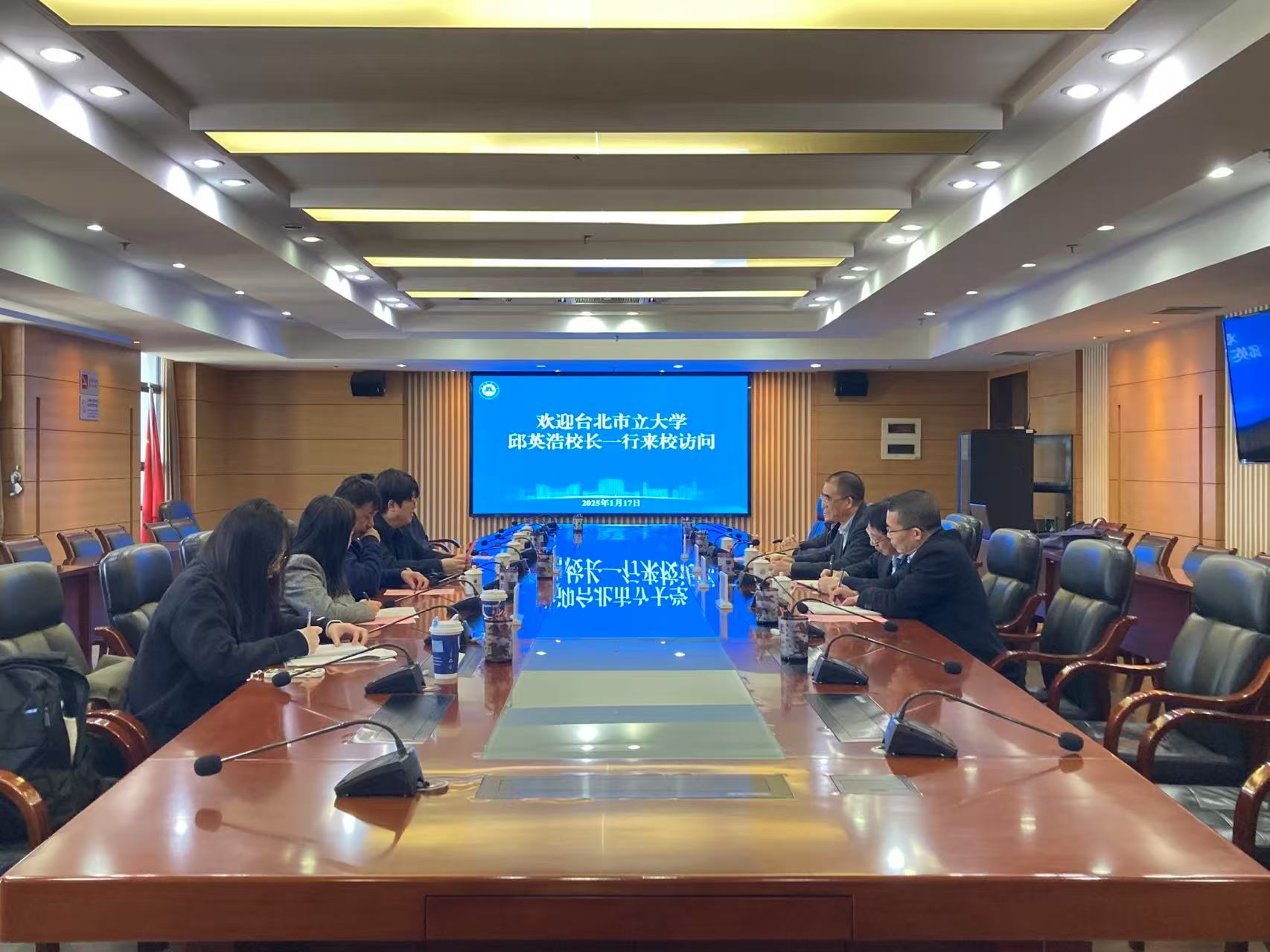 1月17日,台北市立大学校长邱英浩、副校长曾国维一行来校访问。校长郑家建会见来宾一行,台港澳事务办公室、体育科学学院相关负责人参加座谈。