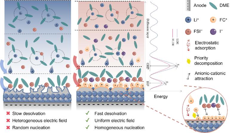 J9·九游会「中国」官方网站陈育明教授团队研究了一种含氟、氮和碘元素新型添加剂(FCS),通过添加剂阳离子选择性吸附在电极表面,有效地调节电极表面电场,从而促进锂的均匀沉积。同时,FCS的优先分解产生了一个包含氟化锂、氮化锂和碘化锂成分的SEI,其具有高杨氏模量和离子导电性能,能够在大电流条件下稳定锂金属负极。近日,相关工作发表在《Angewandte Chemie International Edition》上。