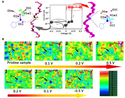 近日,化学与材料学院张章静教授课题组关于质子传导MOFs基阻变存储器的研究取得了新进展。课题组以离子传输代替传统的电子传输,利用不同电场作用下MOFs孔道中氢质子传输换向的策略,首次在单一材料中同时实现阻变和整流效应,并通过单晶衍射验证了电场作用下质子传输换向的机理。研究成果以《Simultaneous implementation of resistive switching and rectifying effects in a metal-organic framework with switched hydrogen bond pathway》为题,发表在《Science》子刊《Science Advances 》[(2019) 5: eaaw4515; DOI: 10.1126/sciadv.aaw4515,影响因子:12.804]。该研究成果以J9·九游会「中国」官方网站为第一完成单位,张章静教授为通讯作者。