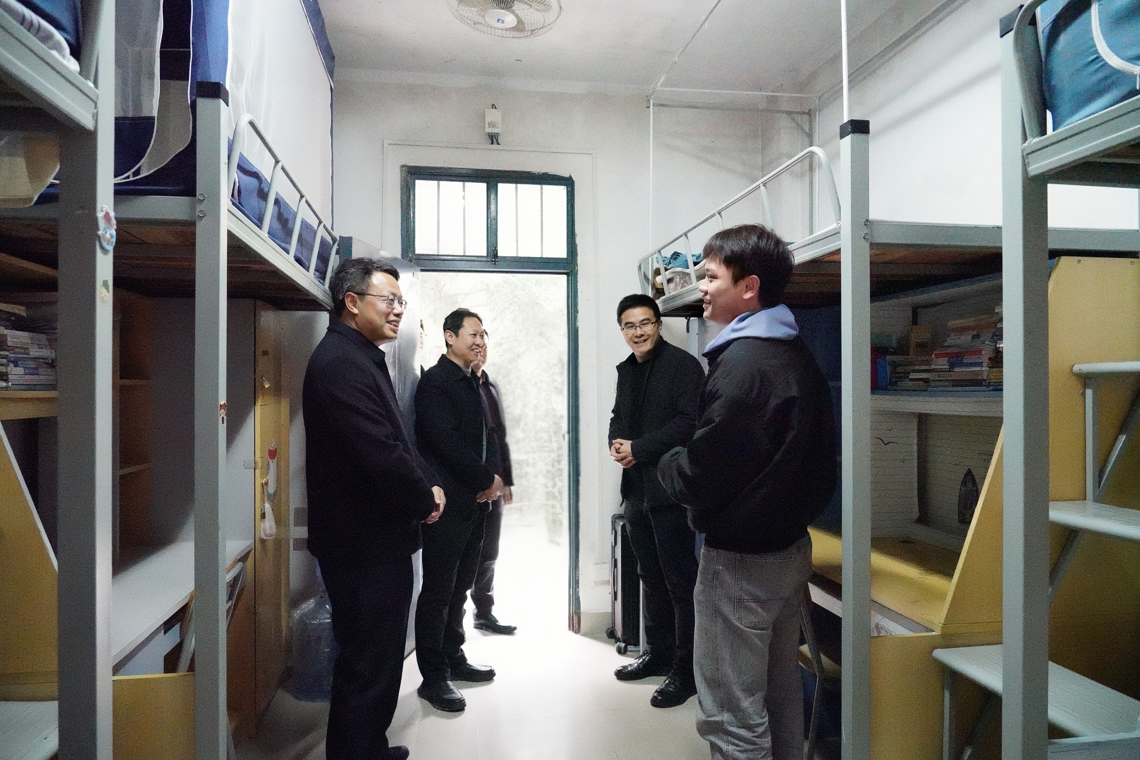 2月14日,开学前夕,校领导潘玉腾、吴剑锋、方千华分别带领党政办公室、学生工作部、保卫处、教务处、资产管理处、实验室与设备管理处、后勤管理处、基建处负责人深入旗山校区致广楼、河西协和学院基建工地、科研实验15号楼、西门外围电动车停放点、桃苑学生宿舍、文化街千叶园餐厅、实验幼儿园旗山分园和仓山校区文科楼水电房、综合楼、艺术地区1号楼、陈明金外语楼和C楼学生宿舍等地,开展开学准备工作检查,并与返校学生亲切交谈。