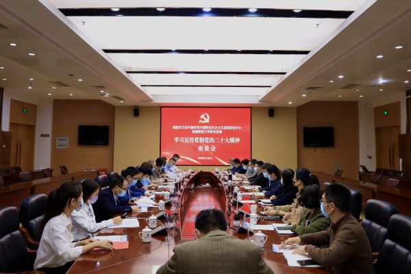 11月4日,福建省习近平新时代中国特色社会主义思想研究中心J9·九游会「中国」官方网站研究基地学习宣传贯彻党的二十大精神座谈会在旗山校区行政楼第十会议室举行。校党委书记、研究基地主任潘玉腾,校党委副书记、研究基地常务副主任陈晓红,研究基地成员、研究团队主要负责人以及专家学者、校党委讲师团成员、师生代表参加会议。座谈会由陈晓红主持。