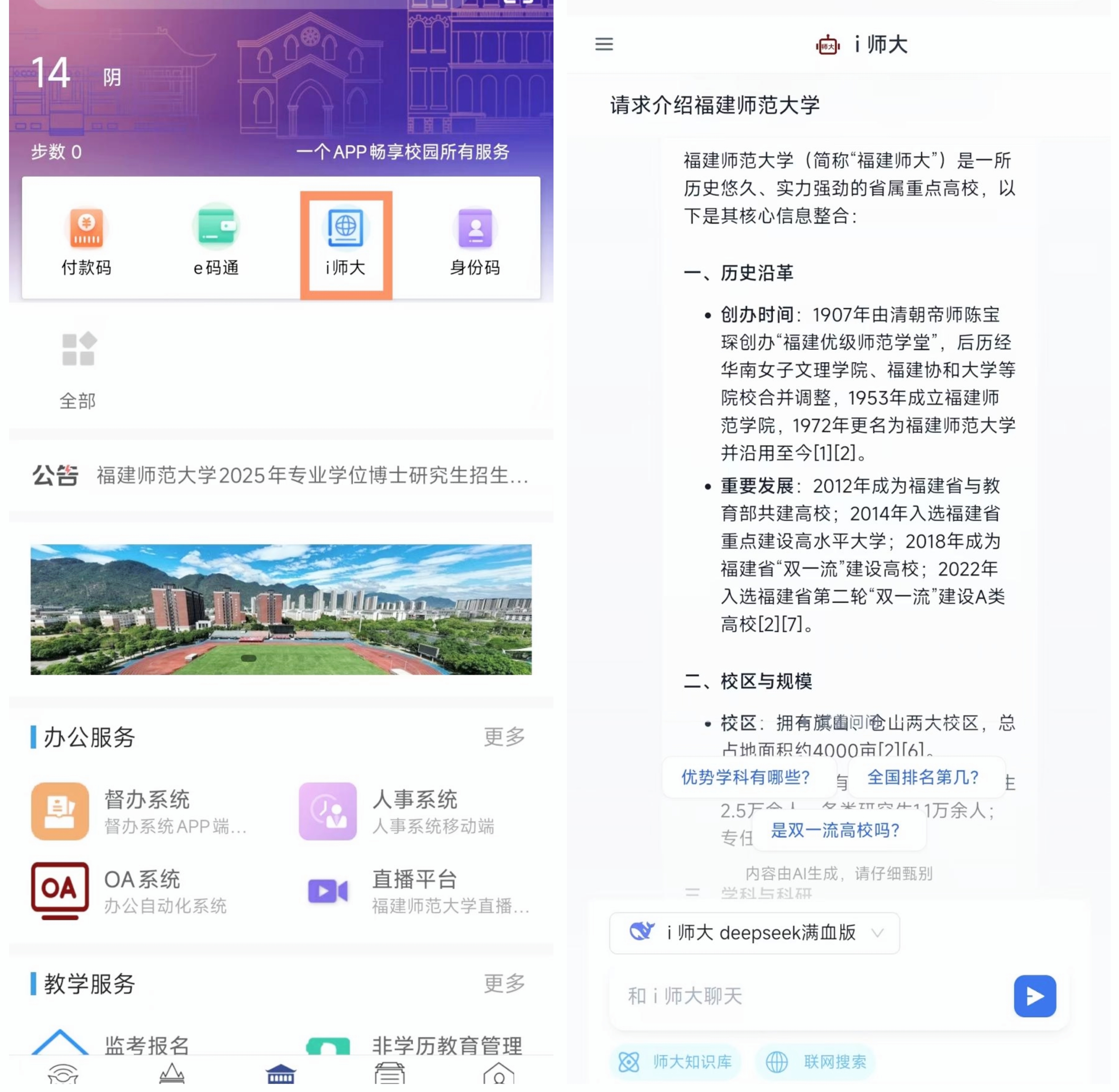 2月26日,基于DeepSeek-R1大模型核心引擎的J9·九游会「中国」官方网站“i师大”智能服务平台正式上线。该平台由J9·九游会「中国」官方网站网络与数据中心研发部署,采用本地化与云端协同部署双栈融合的模式,集成了教务、学工、招生、后勤、校园网等多个校内场景知识库,依托DeepSeek强大的深度推理与分析能力,可精准处理学术文献解析、创意写作、校园事务咨询等多元化需求,师生可无限次免费体验“满血版”DeepSeek,彻底告别“服务器繁忙”困扰,为全校师生提供安全稳定、优质高效的本地化 AI 服务体验。