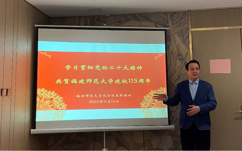 潘玉腾代表学校对在京校友们长期关心和支持母校事业发展表示感谢,对北京校友联络处制作展播公益电影《百年长安》纪念母校建校110周年,以专题纪录片《闽师大道》献礼母校建校115周年表示充分肯定。他指出,校友强则母校兴,母校兴则校友荣,在京的1900多名校友始终心怀心系母校、感怀感念师恩,以己所成回馈母校,以己之力支持母校,生动呈现了校友与母校始终是紧密的“命运共同体”。他表示,在全国上下掀起学习宣传贯彻党的二十大精神热潮之际,在建校115周年的新节点上,学校将立足新时代新征程,赓续百年光荣传统、激发奋进精神力量、矢志建设一流大学,创新书写百年学府发展新篇章,为全面建设社会主义现代化国家、全面推进中华民族伟大复兴作出新的更大贡献。他希望在京校友们继续关心支持母校建设发展,多建睿智之言、多献务实之策,携手共创母校美好未来。