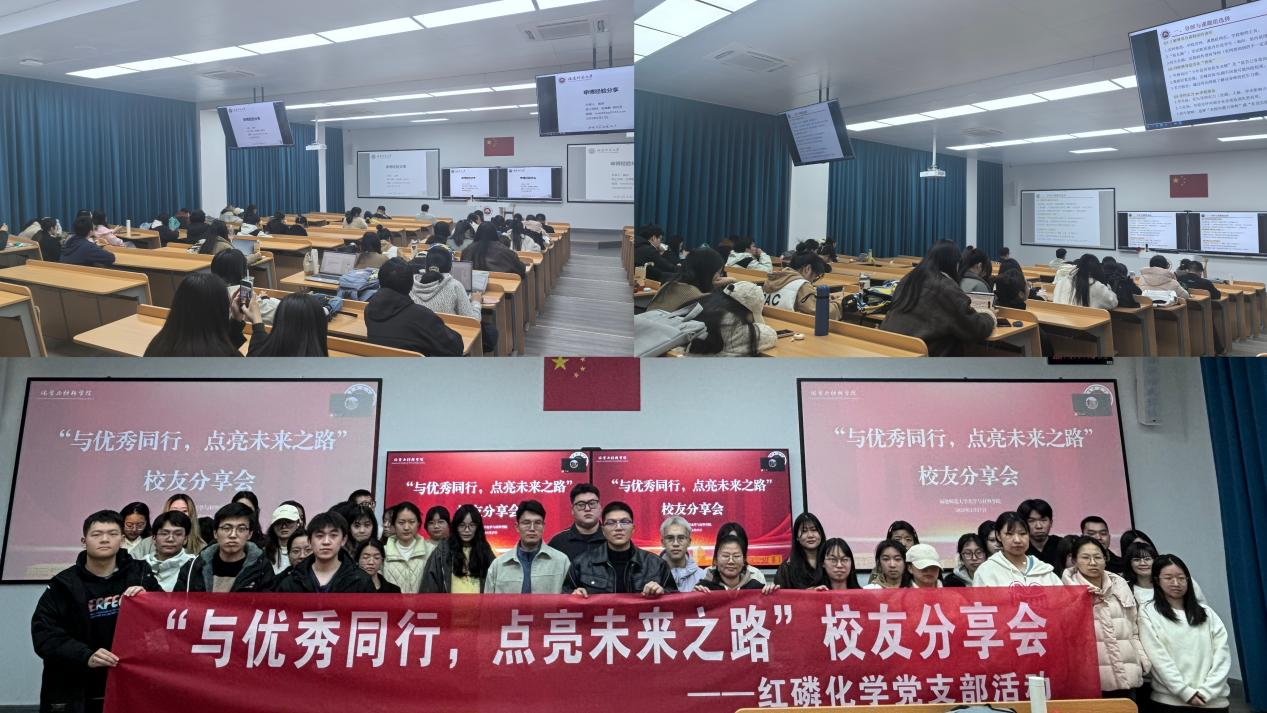2月27日晚,化学与材料学院举办“与优秀同行,点亮未来之路”校友分享会,邀请清华大学博士生居岩、东南大学博士生李彦凯、厦钨新能源研发工程师范建平担任主讲。三位校友结合申博备战、科研规划及职场进阶经历,为现场300多名本科生、研究生解码成长路径。活动通过案例剖析、互动答疑,助力同学们确定目标。现场气氛热烈,多名学生当场制定“科研-就业”双轨路线图,纷纷表示要以校友为标杆,在专业赛道上奋力奔跑。 (化学与材料学院)