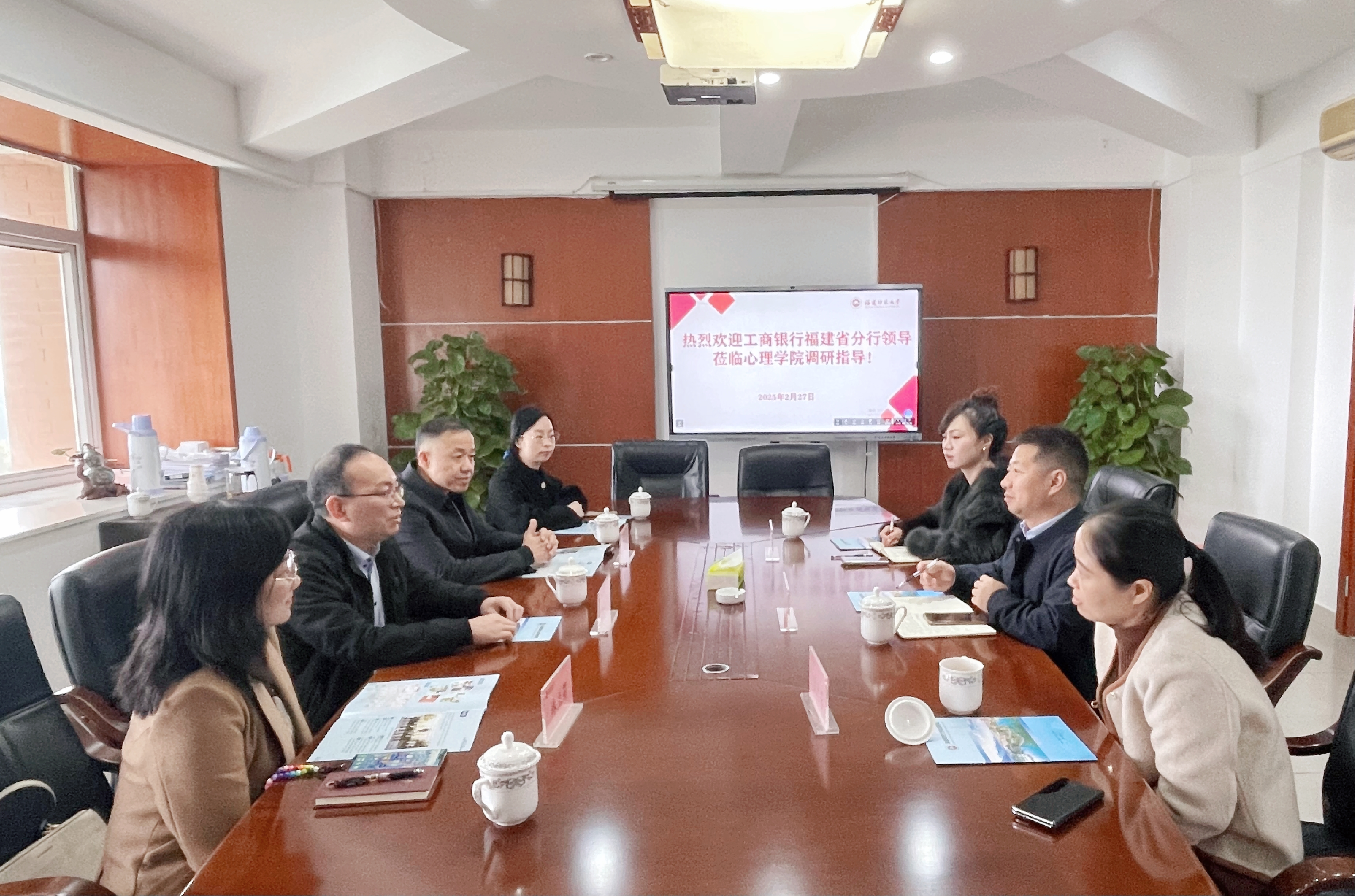 2月27日,中国工商银行福建省分行工会办公室主任吴前锋、研修中心(福建)主任林立莉一行到心理学院交流座谈。心理学院党委书记张本钰、院长孟迎芳、党委副书记苏杭出席会议。