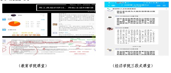 理论课堂师生互动增强。针对理论课堂特点,各学院持续加强课堂互动的趣味性。教育学院采用“小组分享-全班交流-师生总结”的方式,强化课堂应用;经济学院运用“小组汇报-点评讲解-案例分析讨论”的“三段式”教学设计,线上课堂气势氛活跃;地理科学学院注重启发式教学,以学生自主提问和教师随机抽查相结合的方式,增加线上教学的灵活性和趣味性。数学与统计学院的课堂注重了解学生学习情况,教师边“刷屏”边现场点评和讲评。将上课的板书以PDF文档形式导出上传至“学习通”供同学们复习。