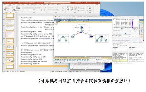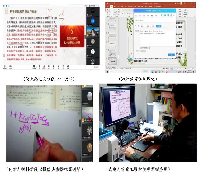 智慧应用助力课堂教学。各学院加强技术应用,提高网络教学环境的真实感和学生学习的体验感。马克思主义学院利用PPT墨迹指针功能进行实时板书;光电与信息工程学院通过手写板呈现电路分析过程;化学与材料学院使用双摄像头直播推算过程;海外教育学院借助腾讯会议配合QQ群聊的屏幕分享,利用鼠标指针标注提示讲解教学内容;计算机与网络空间安全学院设计好仿真模拟器,调试好计算机网络拓扑结构图和配置好网络设备,还原真实课堂场景。
