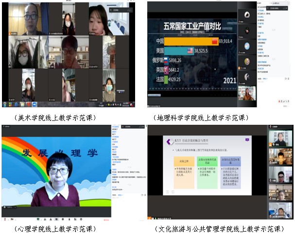 线上“示范”课堂持续推进。重点推进课程思政公开课、教学示范课等从线下转战“云端”。社会历史学院、文化旅游与公共管理学院、地理科学学院、心理学院、美术学院等学院共开设线上示范课15门。马克思主义学院选派专任教师“一对一”指导学院开展课程思政示范课,有效推进课程示范引领作用。
