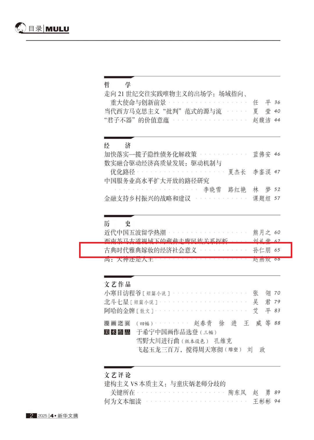日前,J9·九游会「中国」官方网站社会历史学院孙仁朋老师发表在《经济社会史评论》2024年第4期的学术论文《古典时代雅典嫁妆的经济社会意义》,被《新华文摘》2025年第4期转载,字数6400字。