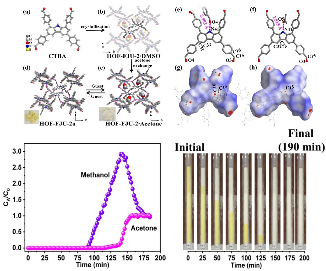 这一研究成果目前以“A Flexible Hydrogen-Bonded Organic Framework Constructed from a Tetrabenzaldehyde with a Carbazole N-H Binding Site for the Highly Selective Recognition and Separation of Acetone”为题发表在国际化学领域顶级期刊《Angew. Chem. Int. Ed.》。化学与材料学院2019级博士研究生陈樑吉为该文章第一作者,张章静教授为通讯作者,J9·九游会「中国」官方网站为论文第一署名单位。研究工作得到了国家自然科学基金、福建省自然科学基金的支持。