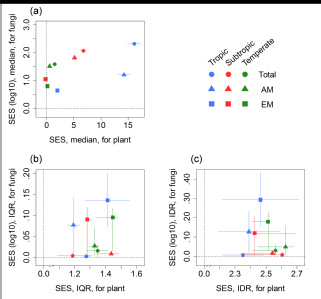 图 针对不同类群和气候区对真菌和植物群落组成的趋异(divergence)或