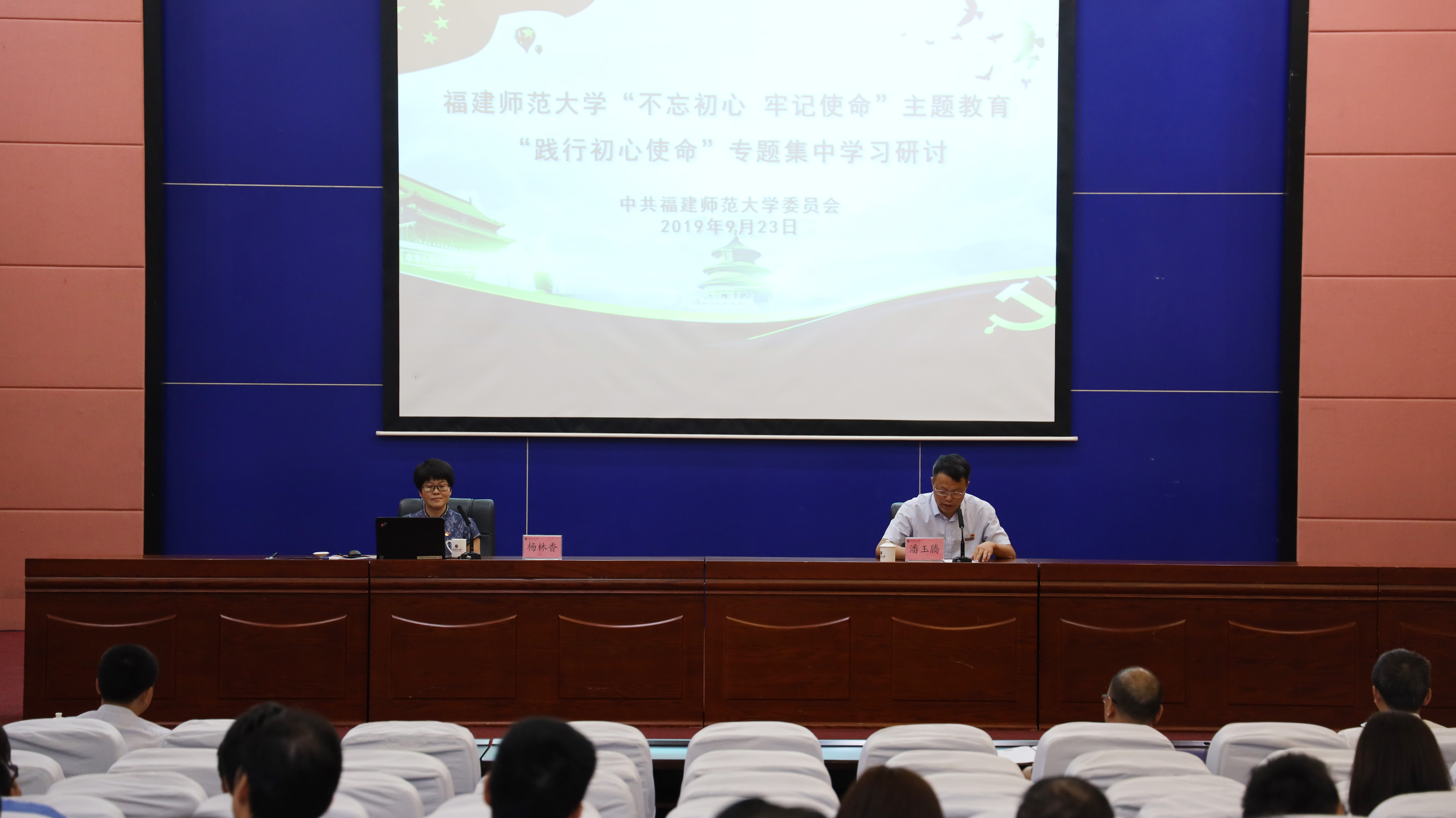 9月23日上午,J9·九游会「中国」官方网站在旗山校区图书馆学术报告厅举行“不忘初心、牢记使命”主题教育第一专题集中辅导会。校领导,全校中层干部,教师党支部负责人等参加了会议。校党委副书记潘玉腾主持报告会。