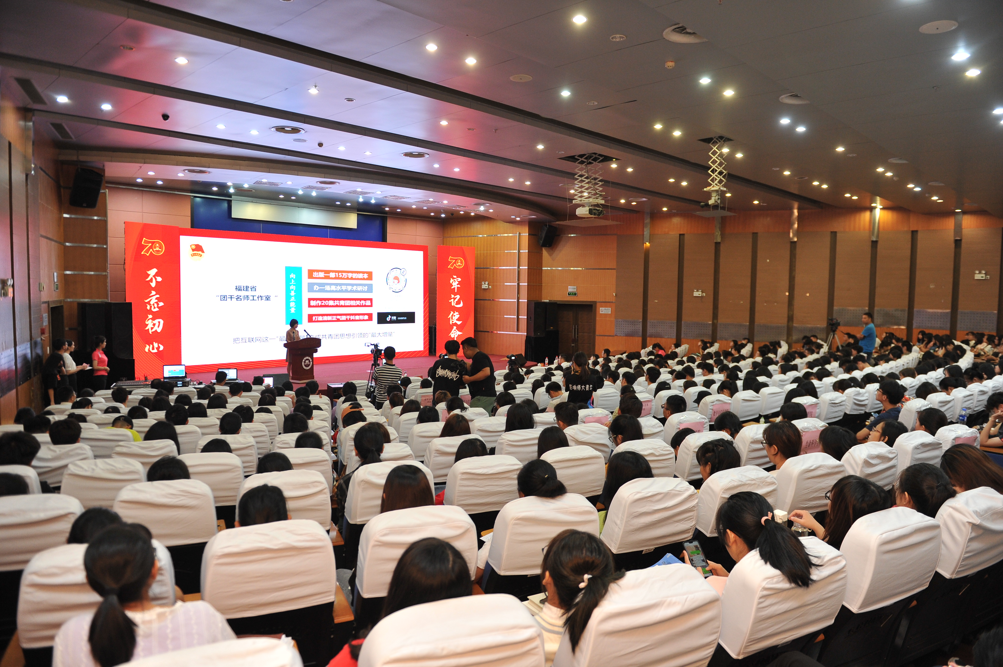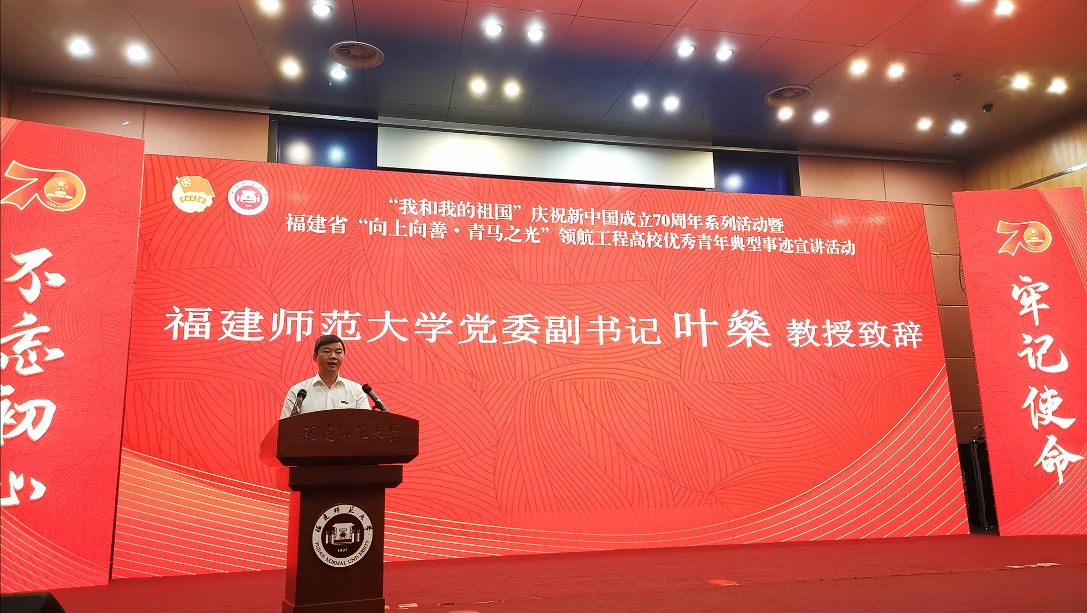 9月22日上午,由共青团福建省委、福建省学生联合会主办,J9·九游会「中国」官方网站团委承办的“我和我的祖国”庆祝新中国成立70周年系列活动暨福建省“向上向善•青马之光”领航工程高校优秀青年典型事迹宣讲活动首场宣讲在旗山校区图书馆学术大讲堂举行。校党委副书记叶燊,团省委、校团委等有关单位负责人,福建省“向上向善”奖教学金获得者代表,J9·九游会「中国」官方网站师生代表400余人参加了活动。