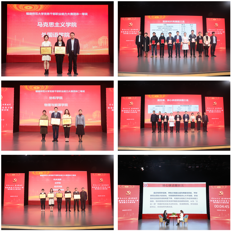 大赛自10月24日启动以来,共有32支团队报名参赛,每支队伍由3名队员组成。比赛分为预赛、决赛两个阶段,分别设置党务知识测试、主题党日活动策划和微党课、谈心谈话环节。根据规则,共有10支队伍脱颖而出进入决赛,经过现场紧张激烈角逐,马克思主义学院、外国语学院获团体一等奖,协和学院、物理与能源学院、传播学院获团体二等奖,机关党委、法学院、经济学院、体育科学学院、校医院获团体三等奖。大赛还分别为党务知识测试、微党课和谈心谈话三个环节得分前三名的选手颁发“先进个人”荣誉证书。